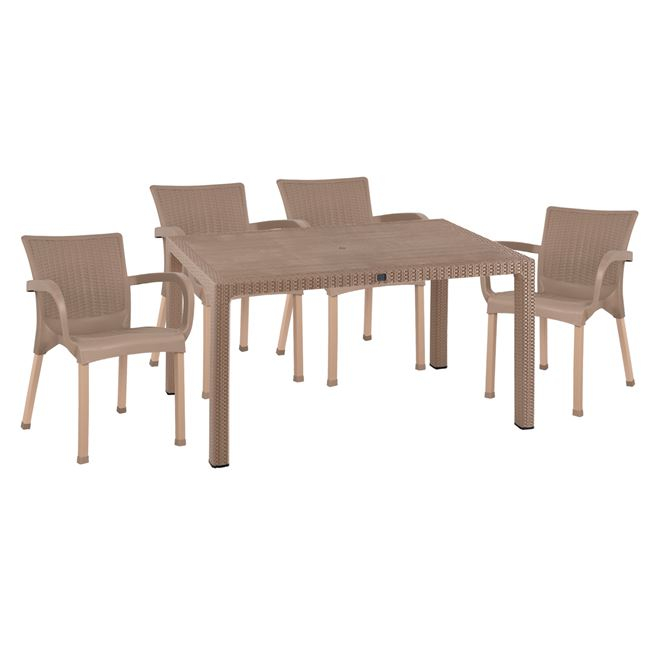 Ένα τραπέζι πολυπροπυλενίου εξωτερικού χώρου σε απόχρωση καπουτσίνο με rattan λεπτομέρειες περιμετρικά της επιφάνειας. Διαθέτει UV protection για μεγαλύτερη προστασία από τον ήλιο.