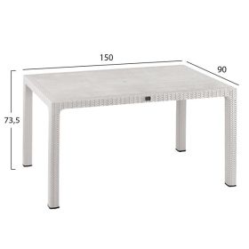 Ένα τραπέζι πολυπροπυλενίου εξωτερικού χώρου σε λευκή απόχρωση με rattan λεπτομέρειες περιμετρικά της επιφάνειας. Διαθέτει UV protection για μεγαλύτερη προστασία από τον ήλιο.