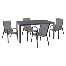 Σετ εξωτερικού χώρου LEOFER με τραπέζι με ΓΚΡΙ μεταλλικό σκελετό και γυάλινη ΕΝΙΣΧΥΜΕΝΗ επιφάνεια και 4 μεταλλικές πολυθρόνες με textilene σε ΓΚΡΙ χρώμα. Οι πολυθρόνες είναι ΣΤΟΙΒΑΖΟΜΕΝΕΣ άρα και ιδιαιτέρως πρακτικές, αφού αποθηκεύονται εύκολα και στον μικρότερο δυνατό χώρο.