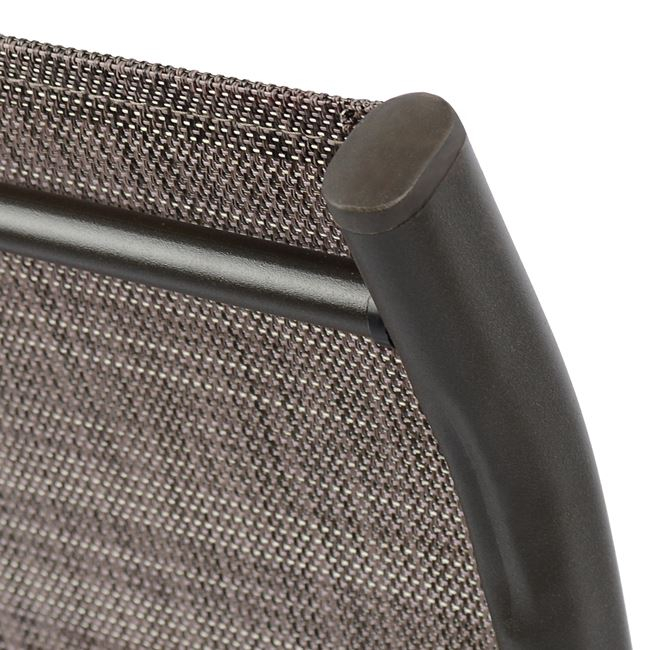 Δύο πολυθρόνες εξωτερικού χώρου από μεταλλικό σκελετό σε καφέ χρώμα με textilene 2x1 μεγάλης αντοχής σε ήλιο και βροχή.