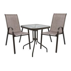 Ένα τραπέζι μεταλλικό εξωτερικού χώρου σε χρώμα καφέ, με ενσωματωμένο τζαμί ασφάλειας (secure).