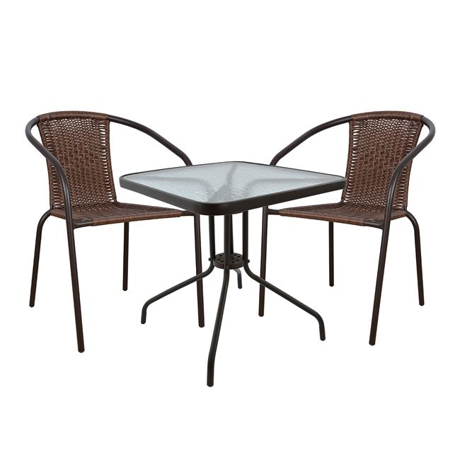 Η πλάτη και το κάθισμα είναι ντυμένα με πλεκτό συνθετικό υλικό wicker σε σκούρο καφέ χρώμα.