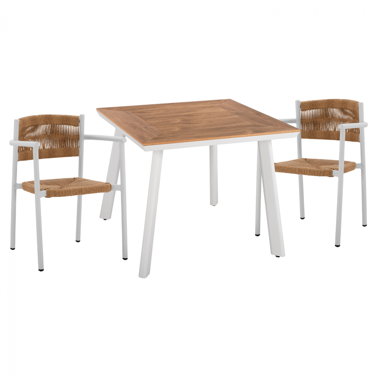 Ένα τραπέζι τραπεζαρίας με επιφάνεια Polywood σε φυσική απόχρωση και σκελετό αλουμινίου σε λευκό χρώμα.