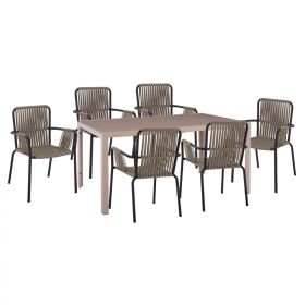 Έξι μοντέρνες πολυθρόνες εξωτερικού χώρου κατασκευασμένες από αλουμίνιο, σε ανθρακί απόχρωση, επενδυμένη με πλεκτό pe πλατύ κορδόνι στην πλάτη και την έδρα σε καπουτσίνο απόχρωση.