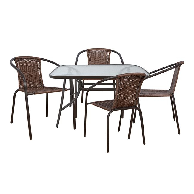 Η πλάτη και το κάθισμα είναι ντυμένα με πλεκτό συνθετικό υλικό wicker σε σκούρο καφέ χρώμα.