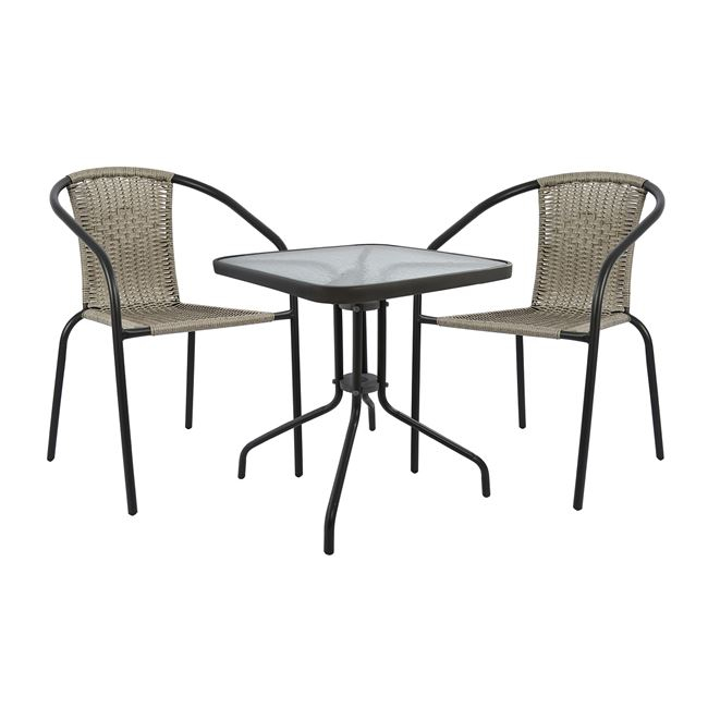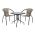 Η πλάτη και το κάθισμα είναι ντυμένα με πλεκτό συνθετικό υλικό wicker σε ανοιχτό γκρι χρώμα.