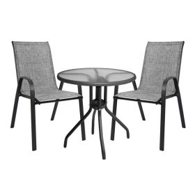 Ένα τραπέζι μεταλλικό εξωτερικού χώρου σε χρώμα γκρι-ανθρακί, με ενσωματωμένο τζαμί ασφάλειας (secure).