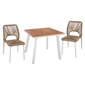 Δύο μοντέρνες καρέκλες κατασεκυασμένες από σκελετό αλουμινίου σε λευκή απόχρωση, επενδυμένη με πλεκτό ενισχυμένο PE σχοινί στο κάθισμα και στην πλάτη σε μπεζ απόχρωση.