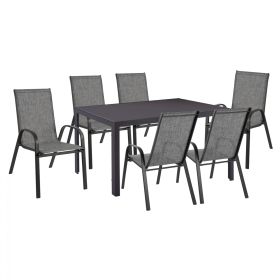 Έξι μοντέρνες πολυθρόνες εξωτερικού χώρου κατασκευασμένες από μέταλλο και textilene 2x1 μεγάλης αντοχής σε ήλιο και βροχή, σε γκρι απόχρωση.
