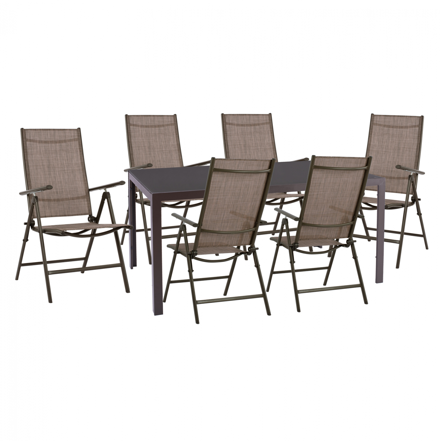 Έξι μοντέρνες πτυσσόμενες πολυθρόνες εξωτερικού χώρου κατασκευασμένες από μεταλλικό σκελετό σε καφέ απόχρωση