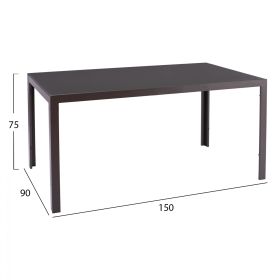 Ένα τραπέζι τραπεζαρίας εξωτερικού χώρου σε καφέ απόχρωση με γυαλί στην επιφάνειά του.