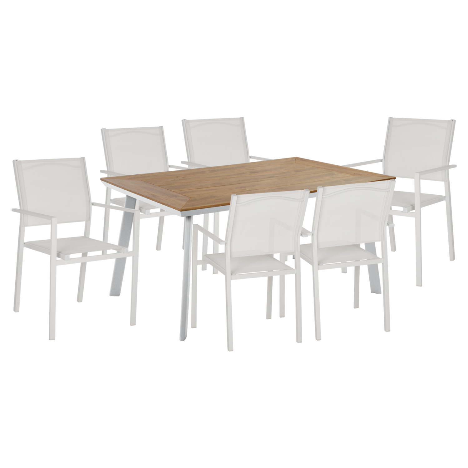 ΗΜ11831—Σετ εξωτερικού χώρου με τραπέζι με ΛΕΥΚΟ αλουμινένιο σκελετό και επιφάνεια από polywood και 6 μεταλλικές πολυθρόνες με textilene, σε ΛΕΥΚΟ χρώμα.