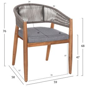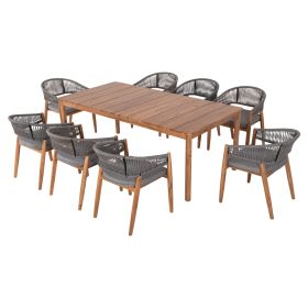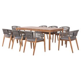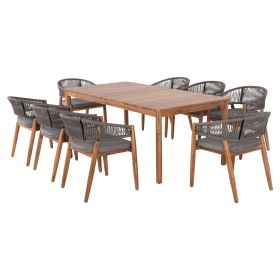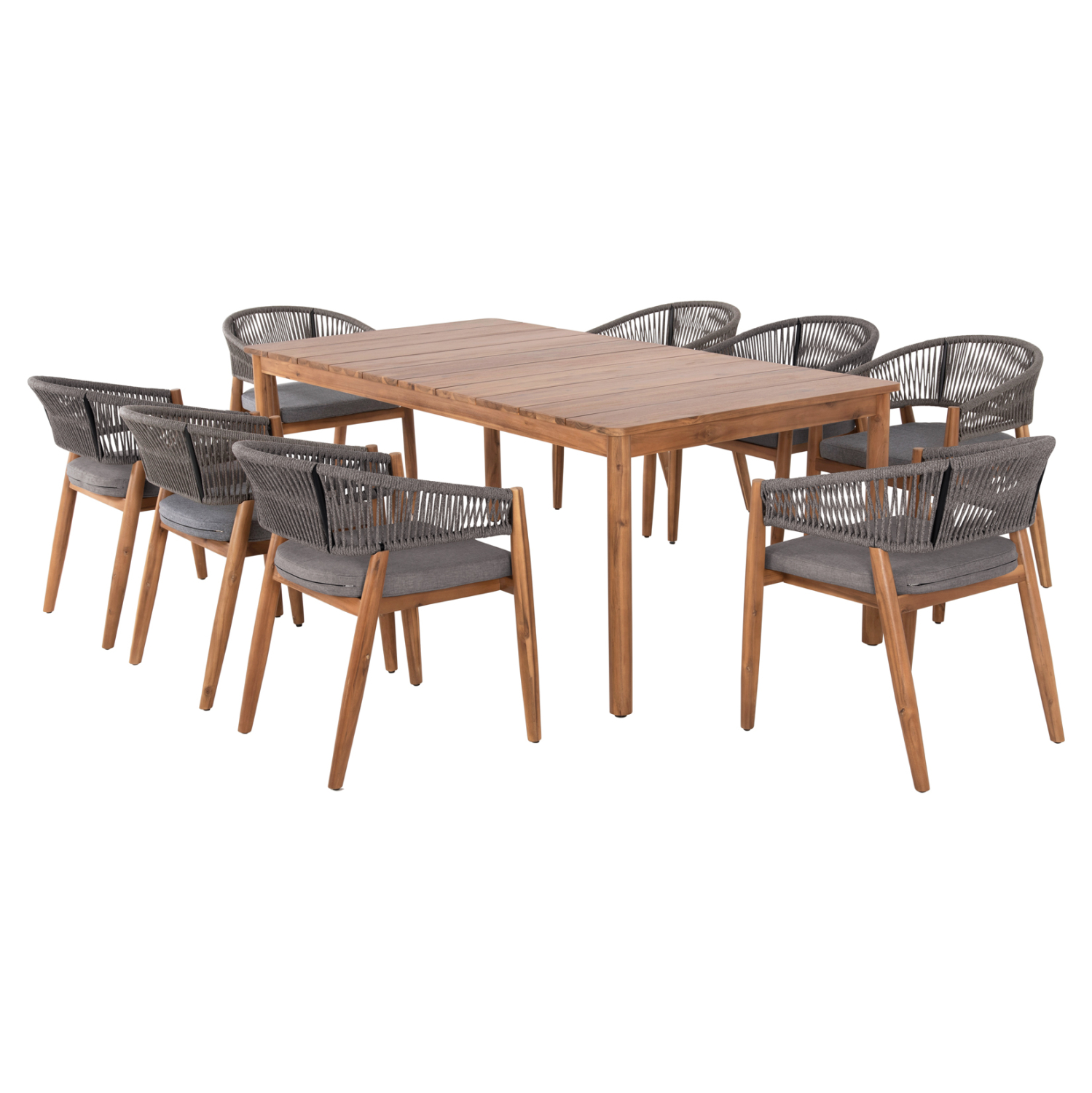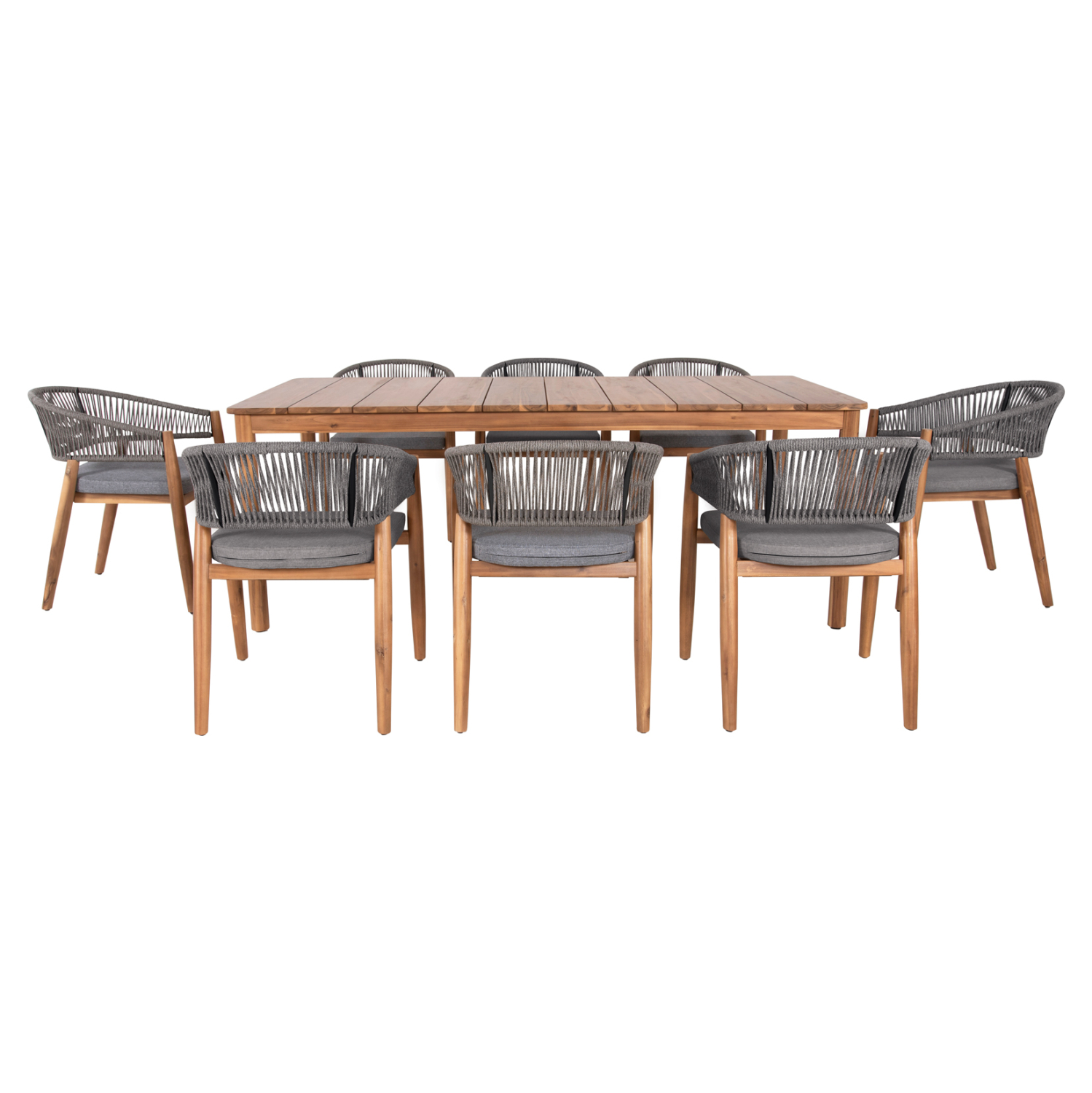 Αυτό το σετ τραπεζαρίας εξωτερικού χώρου 9τμχ αποτελείται από το όμορφο χειροποίητο τραπέζι NAVANT κατασκευασμένο εξολοκλήρου από φυσικό μασίφ ξύλο ΑΚΑΚΙΑΣ σε ΦΥΣΙΚΟ χρώμα, και από 8 καρέκλες τραπεζαρίας NAVAN κατασκευασμένες επίσης από ξύλο ακακίας και σχοινί nylon σε ΓΚΡΙ χρώμα.