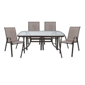 Ένα τραπέζι μεταλλικό εξωτερικού χώρου σε χρώμα καφέ, με ενσωματωμένο γυαλί ασφαλείας (tempered).