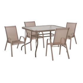 Σετ εξωτερικού χώρου με τραπέζι με ΣΑΜΠΑΝΙ μεταλλικό σκελετό και γυάλινη θολή ΕΝΙΣΧΥΜΕΝΗ επιφάνεια και 4 μεταλλικές πολυθρόνες με textilene σε ΣΑΜΠΑΝΙ χρώμα.