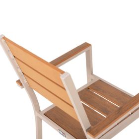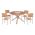 Ένα στρογγυλό τραπέζι με αλουμινένιο σκελετό σε ΣΑΜΠΑΝΙ χρώμα και επιφάνεια από polywood, και 4 πολυθρόνες αλουμινίου σε ΣΑΜΠΑΝΙ χρώμα με κάθισμα και πλάτη από polywood.