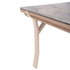 Σας παρουσιάζουμε το εντυπωσιακό σετ τραπεζαρίας εξωτερικού χώρου DRIMM που αποτελείται από ένα μεγάλο τραπέζι και 6 πολυθρόνες. Ένα σετ που θα το λατρέψετε με την πρώτη ματιά. Ο σκελετός σε όλο το σετ είναι από αλουμίνιο σε ΜΠΕΖ χρώμα επενδυμένο με σχοινί σε χρώμα ΚΑΠΟΥΤΣΙΝΟ. Το όμορφο τραπέζι έχει επιφάνεια από HPL σε χρωματισμό ΓΚΡΙ ΜΑΡΜΑΡΟΥ. Το design τους είναι πανέμορφο στην όψη ενώ η στιβαρότητά τους είναι εμφανής. Το κάθισμα στις πολυθρόνες είναι φαρδύ ενώ η πλάτη τους αγκαλιάζει το σώμα πράγμα που επιτείνει την άνεση που προσφέρουν, σε συνδυασμό με τα αναπαυτικά μαξιλάρια τόσο στο κάθισμα όσο και στην πλάτη. Τα μαξιλάρια είναι επενδυμένα με ποιοτικό ύφασμα σε χρώμα ΚΑΠΟΥΤΣΙΝΟ και διαθέτουν γέμισμα με μέτριας σκληρότητας αφρώδη υλικά για την μεγαλύτερη δυνατή άνεση, αλλά και φερμουάρ για να αφαιρούνται τα καλύμματα. Τι άλλο να ζητήσει κανείς για να αναβαθμίσει τον εξωτερικό του χώρο;