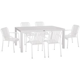 Αυτό το σετ τραπεζαρίας εξωτερικού χώρου αποτελείται από ένα ΛΕΥΚΟ επεκτεινόμενο τραπέζι αλουμινίου και 6 ΛΕΥΚΕΣ πολυθρόνες αλουμινίου. Οι πολυθρόνες είναι στοιβαζόμενες.