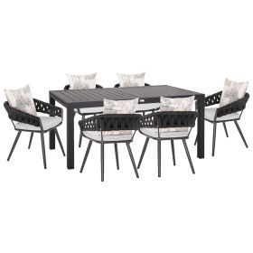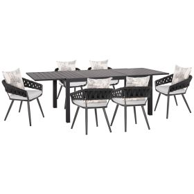 Αυτό το σετ τραπεζαρίας εξωτερικού χώρου αποτελείται από ένα ΣΚΟΥΡΟ ΓΚΡΙ επεκτεινόμενο τραπέζι αλουμινίου και 6 ΣΚΟΥΡΕΣ ΓΚΡΙ πολυθρόνες αλουμινίου με ΕΚΡΟΥ μαξιλάρι καθίσματος και επένδυση από συνθετικό σχοινί (terylene) σε ΣΚΟΥΡΟ ΓΚΡΙ. Οι πολυθρόνες είναι και στοιβαζόμενες.
