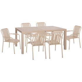 Αυτό το σετ τραπεζαρίας εξωτερικού χώρου αποτελείται από ένα επεκτεινόμενο τραπέζι αλουμινίου σε καπουτσίνο χρώμα και 6 ΣΑΜΠΑΝΙ πολυθρόνες αλουμινίου. Οι πολυθρόνες είναι στοιβαζόμενες.