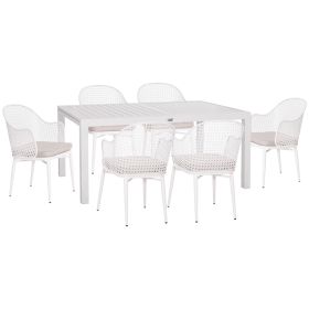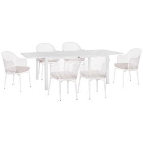 Αυτό το σετ τραπεζαρίας εξωτερικού χώρου αποτελείται από ένα ΛΕΥΚΟ επεκτεινόμενο τραπέζι αλουμινίου και 6 ΛΕΥΚΕΣ πολυθρόνες αλουμινίου με ΓΚΡΙ μαξιλάρι καθίσματος.