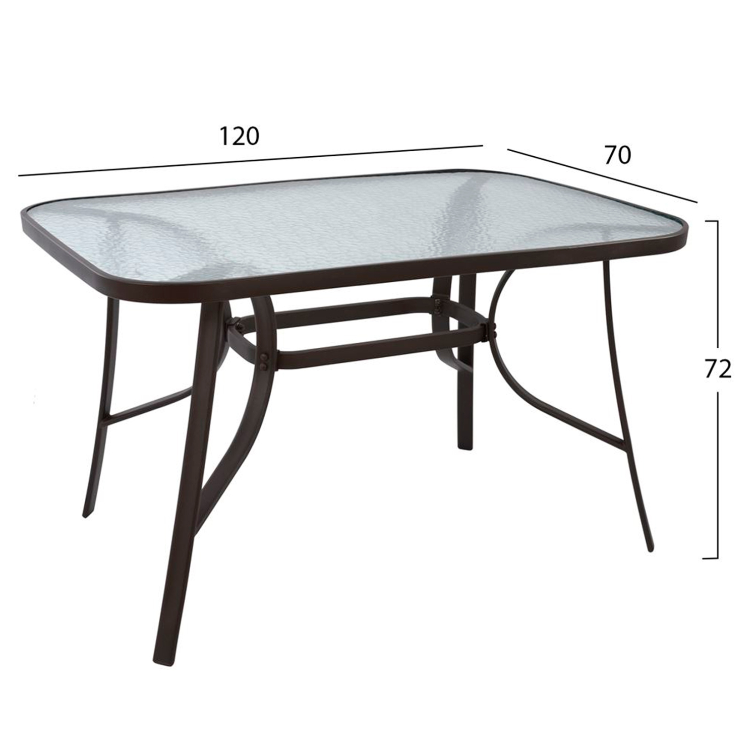 Σετ εξωτερικού χώρου με τραπέζι με ΚΑΦΕ μεταλλικό σκελετό και γυάλινη θολή ΕΝΙΣΧΥΜΕΝΗ επιφάνεια και 4 μεταλλικές πολυθρόνες με wicker σε όψη rattan σε ΚΑΦΕ χρώμα.