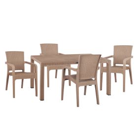 Το ΗΜ11762 είναι ένα σετ τραπεζαρίας εξωτερικού χώρου κατασκευασμένο εξολοκλήρου από πολυπροπυλένιο σε χρώμα ανοιχτό ΚΑΠΟΥΤΣΙΝΟ (ανοιχτό καφέ). Αποτελείται από 4 πολυθρόνες και 1 τραπέζι. Ιδανική πρόταση για χρήση σε εξωτερικούς χώρους τόσο στο σπίτι όσο και σε επαγγελματικούς χώρους. Η καρέκλα/πολυθρόνα αποτελείται από ένα χυτό σύνολο καθίσματος-πλάτης-μπράτσων με όψη πλέξης, ενώ τα μπράτσα είναι ψηλά και σχετικά φαρδιά με αποτέλεσμα να προσφέρουν άνεση κατά την χρήση. Το τραπέζι ακολουθεί την ίδια αισθητική και είναι μεγάλο σε διαστάσεις.