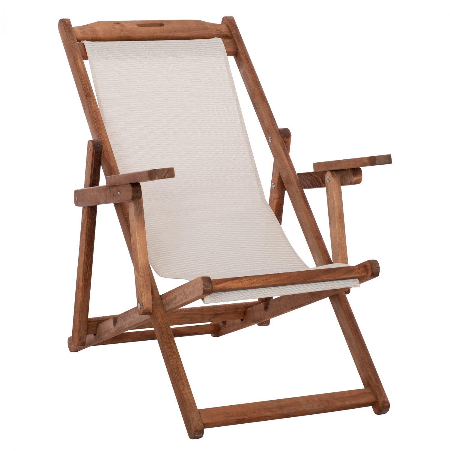 Σεζλόνγκ Λήμνος, με μπράτσα σε καρυδί απόχρωση και εκρού pvc πλέξης 2x1.