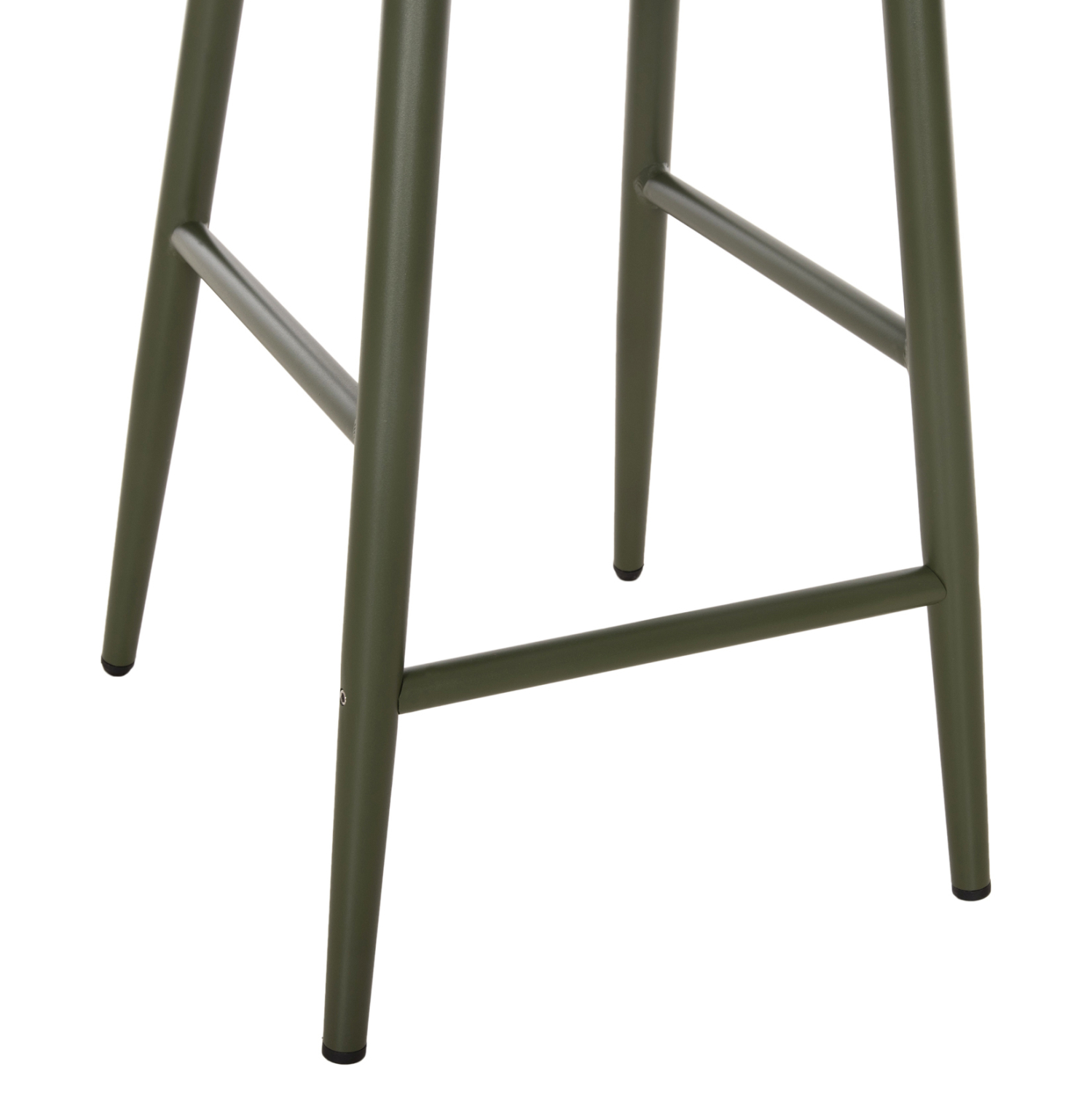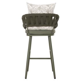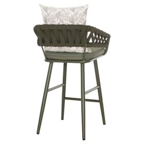 Το σκαμπό μπαρ αλουμινίου CAMDEN σε DARK OLIVE χρώμα δεν έχει ξεχωριστά μπράτσα αλλά η πλάτη είναι ημικυκλική αγκαλιάζοντας το σώμα. Πρόκειται για ένα ξεχωριστό σκαμπό με χαμηλή πλάτη από συνθετικό φαρδύ πολυεστερικό σχοινί (terylene). Το ιδιαίτερο χαρακτηριστικό αυτού του σκαμπό είναι ότι διαθέτει αναπαυτικά μαξιλάρια (με φερμουάρ) τόσο στο κάθισμα σε DARK OLIVE χρώμα, όσο και στην πλάτη σε λευκό χρώμα με PRINT σχέδιο.