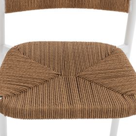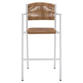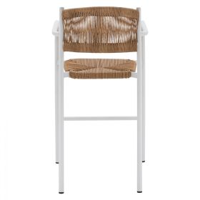 Μοντέρνο σκαμπό bar, κατασκευασμένo από σκελετό αλουμινίου σε λευκή απόχρωση, επενδυμένο με σχοινί στην πλάτη και στο κάθισμα σε μπεζ απόχρωση.