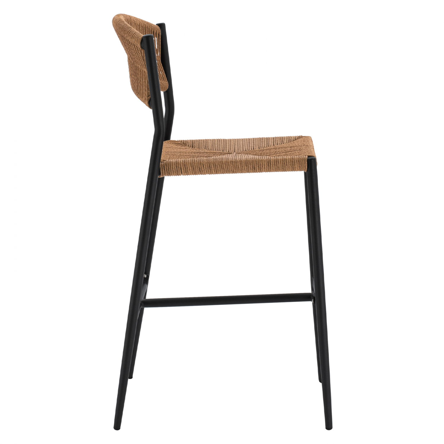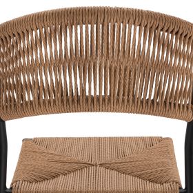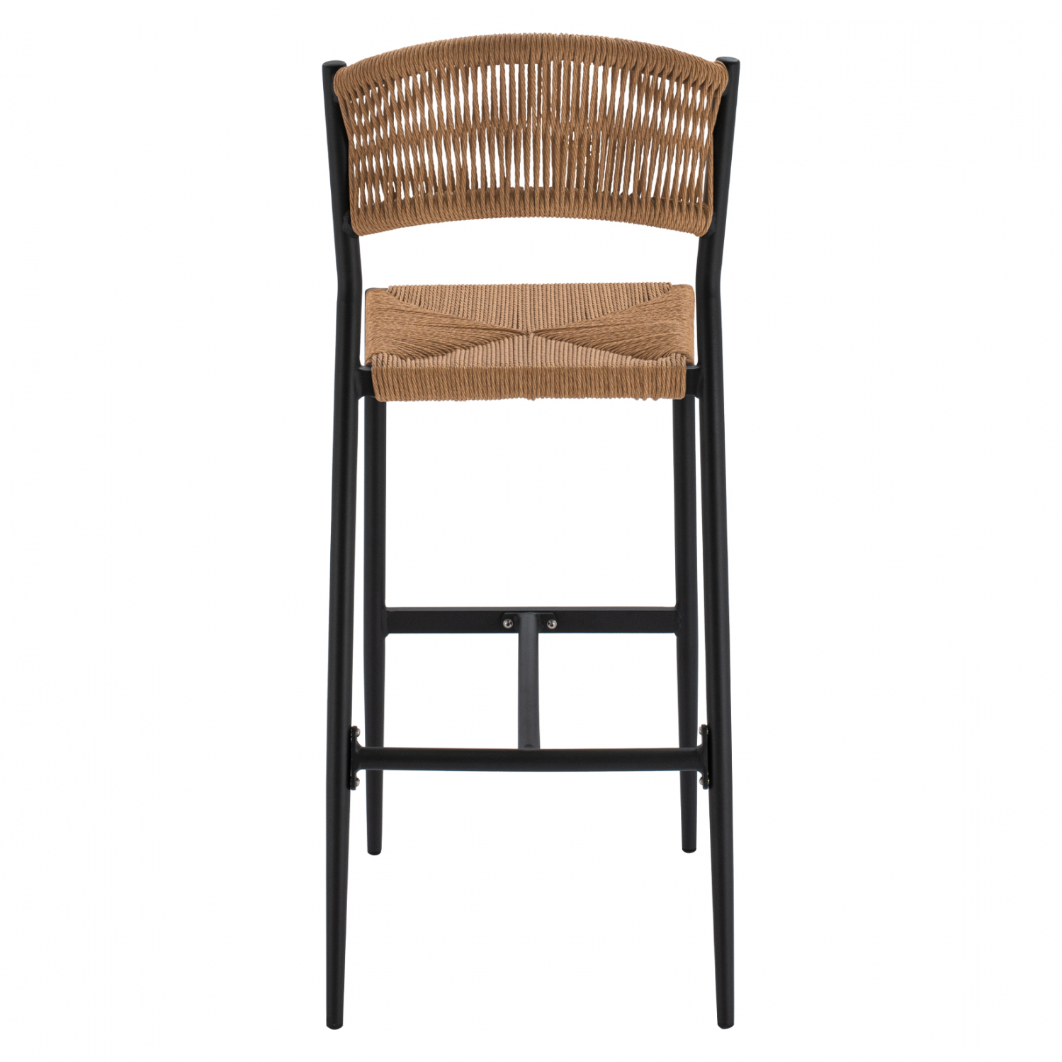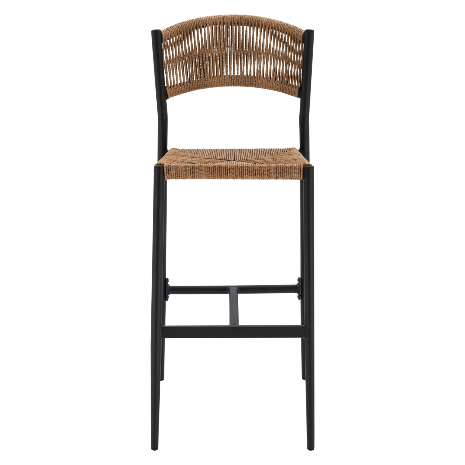 Μοντέρνο σκαμπό bar, κατασκευασμένo από σκελετό αλουμινίου σε ανθρακί απόχρωση, επενδυμένο με πλεκτό ενισχυμένο PE σχοινί στο κάθισμα και στην πλάτη σε μπεζ απόχρωση.