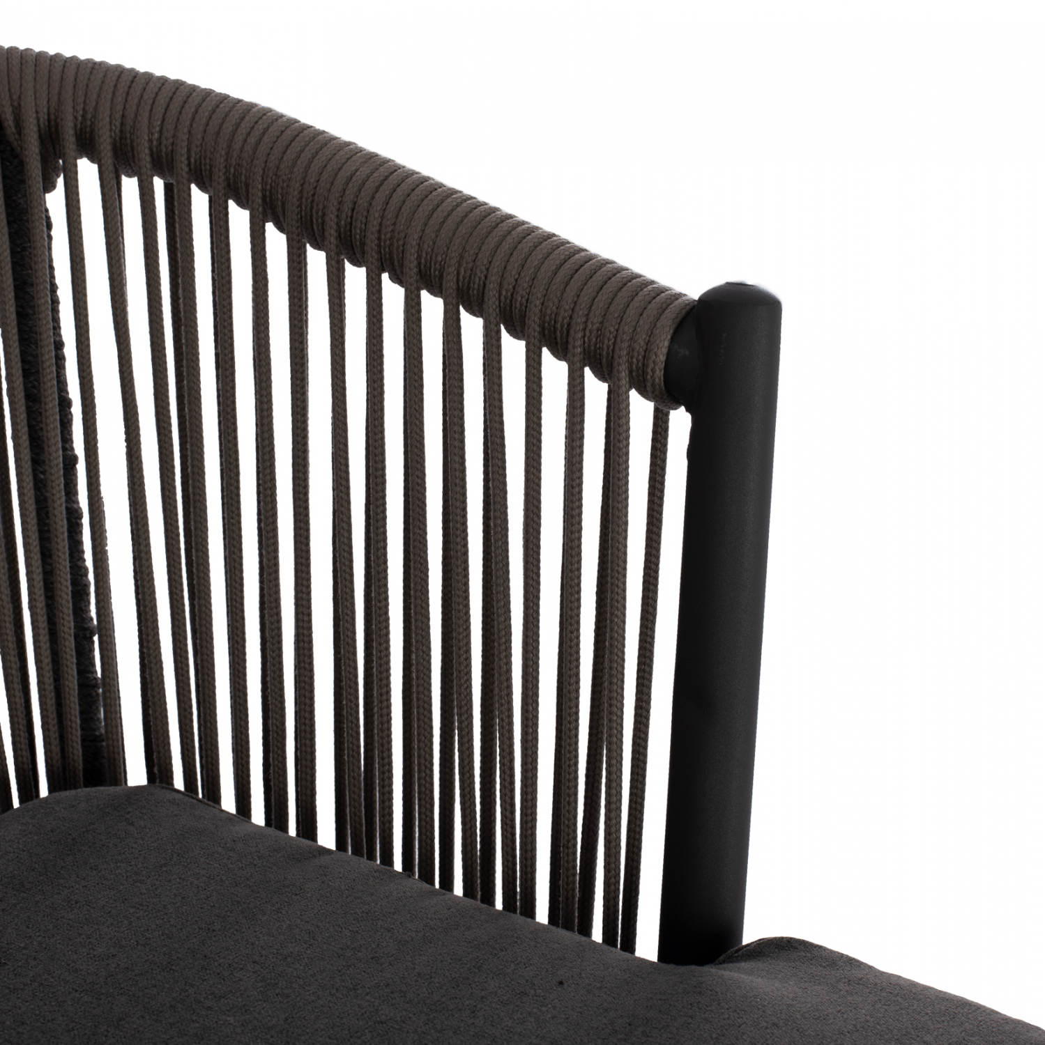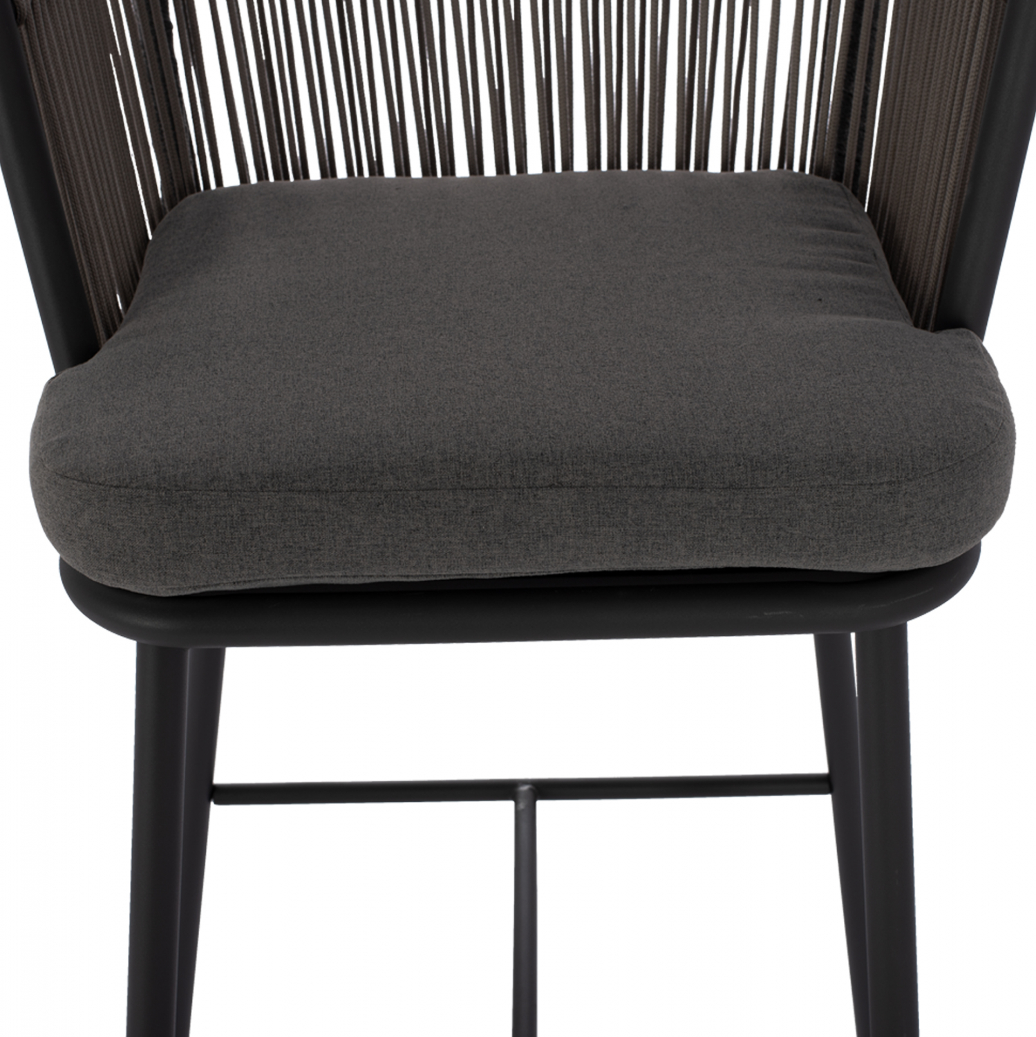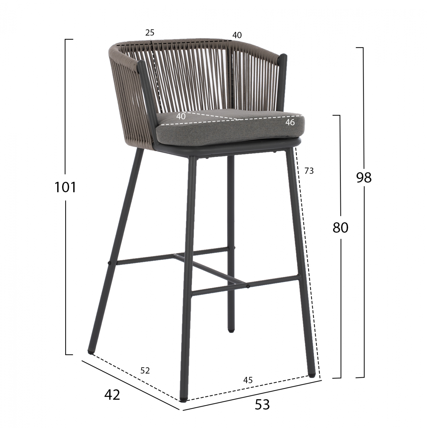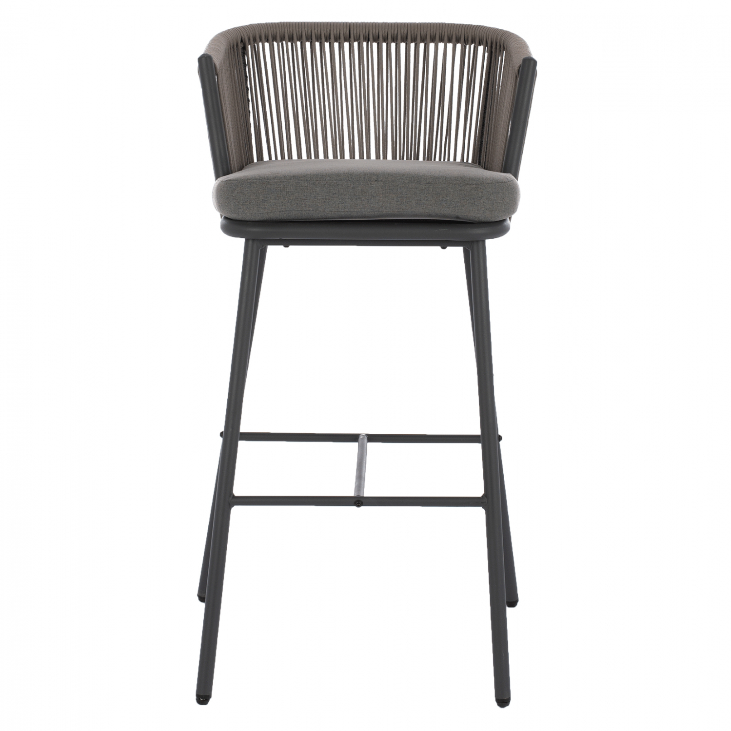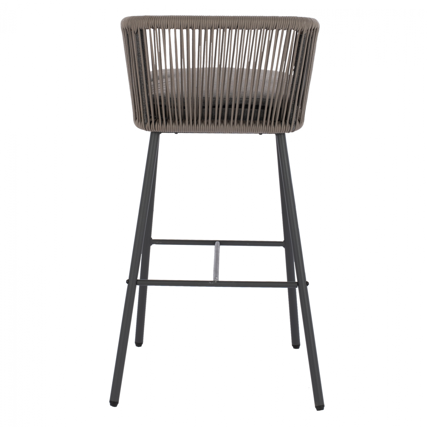 Μοντέρνο σκαμπό με πλάτη και μαξιλάρι, εξωτερικού αλλά και εσωτερικού χώρου, κατασκευασμένο από μεταλλικό σκελετό σε γκρι απόχρωση, επενδυμένο με πλεκτό σχοινί σε επίσης γκρι απόχρωση.