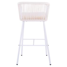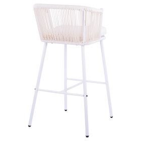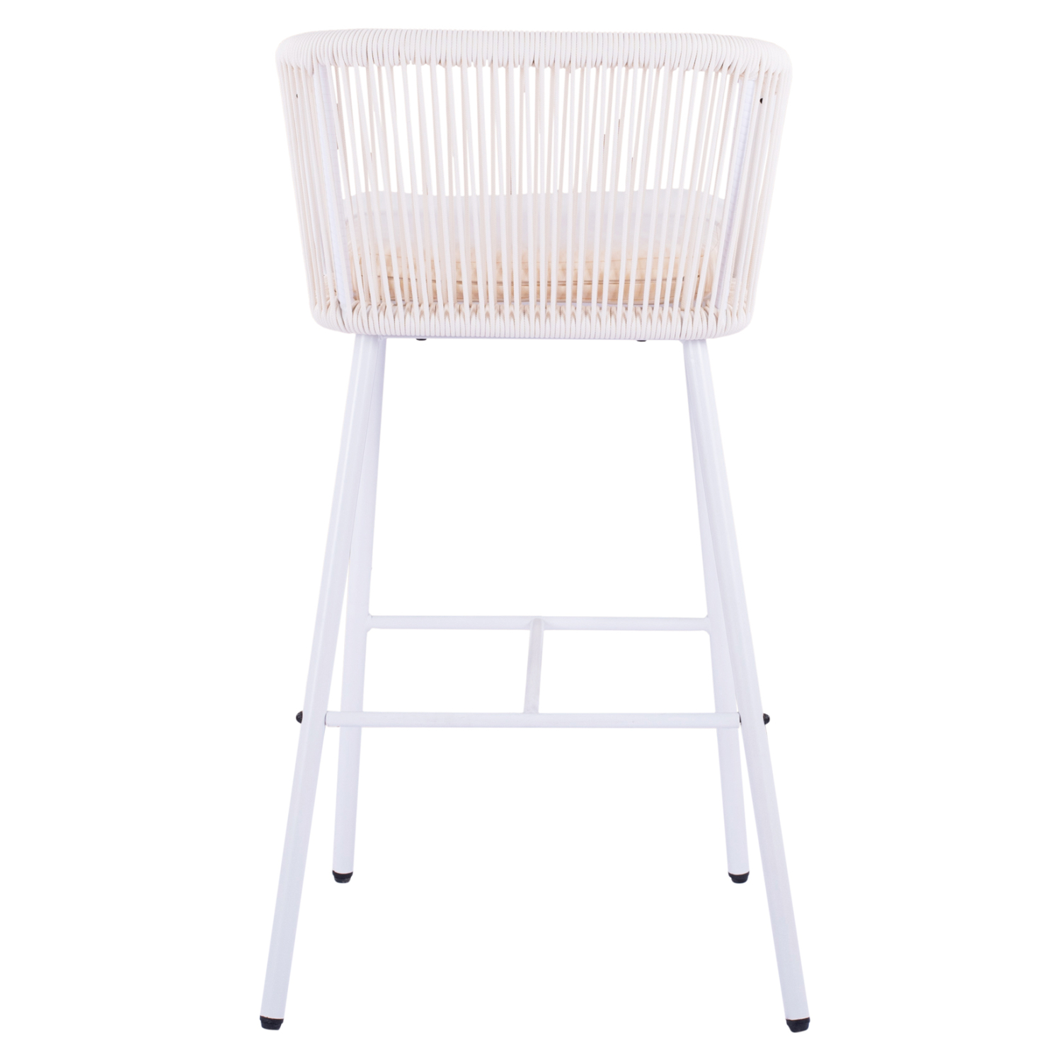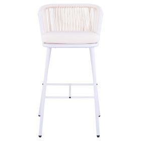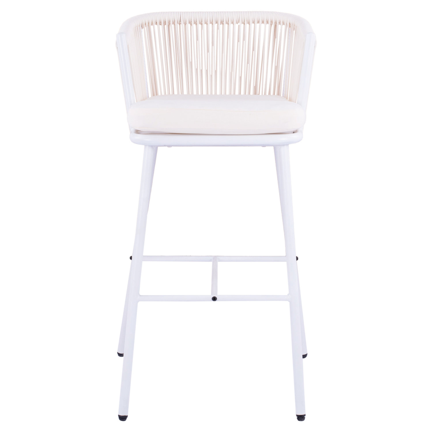 Μοντέρνο σκαμπό με πλάτη και μαξιλάρι, εξωτερικού αλλά και εσωτερικού χώρου, κατασκευασμένο από μεταλλικό σκελετό σε λευκή απόχρωση, επενδυμένο με πλεκτό σχοινί σε λευκή απόχρωση.