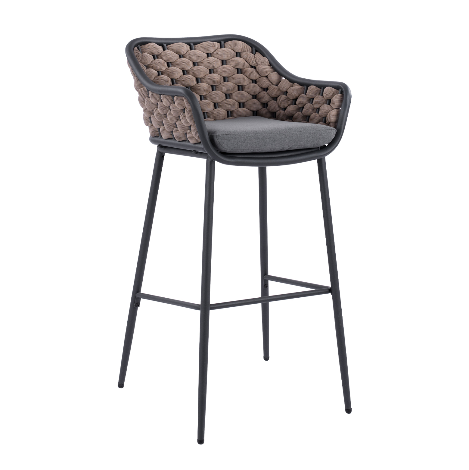 Μοντέρνο σκαμπό με πλάτη και μαξιλάρι, εξωτερικού αλλά και εσωτερικού χώρου, κατασκευασμένο από μεταλλικό σκελετό σε γκρι απόχρωση, επενδυμένο με wicker σχοινί σε μπεζ απόχρωση.