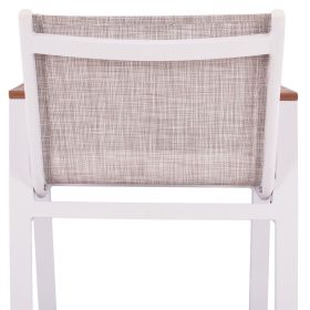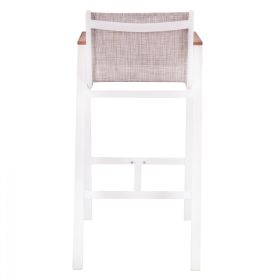 Μοντέρνο σκαμπό bar, κατασκευασμένo από σκελετό αλουμινίου και textline 2x2 σε λευκή απόχρωση, με δύο επιφάνειες polywood σε φυσική απόχρωση στα μπράτσα.