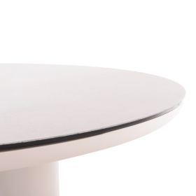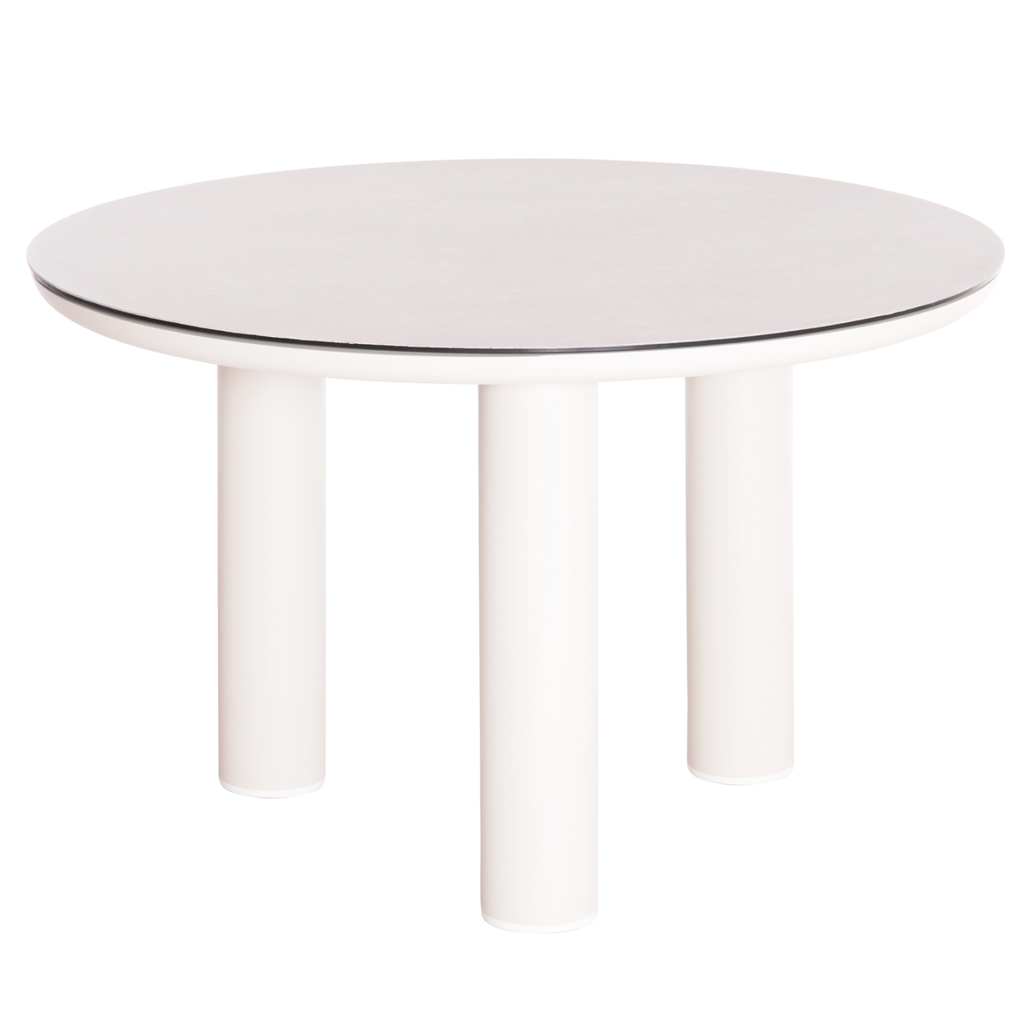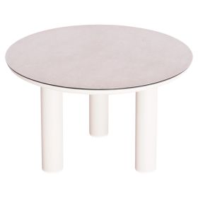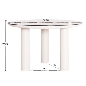 Το DOSUN είναι ένα στρογγυλό τραπέζι τραπεζαρίας για εξωτερικούς χώρους με σκελετό αλουμινίου σε ΚΡΕΜ απόχρωση με 3 κυλινδρικά πόδια/κολώνες. Η επιφάνεια είναι από 3D PRINTED γυαλί σε ανοιχτό ΓΚΡΙ χρωματισμό, και με όψη κεραμική. Πρόκειται για ένα όμορφο τραπέζι σε κανονική διάσταση, που μπορεί να εξυπηρετήσει μέχρι 5 άτομα.