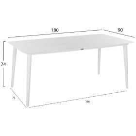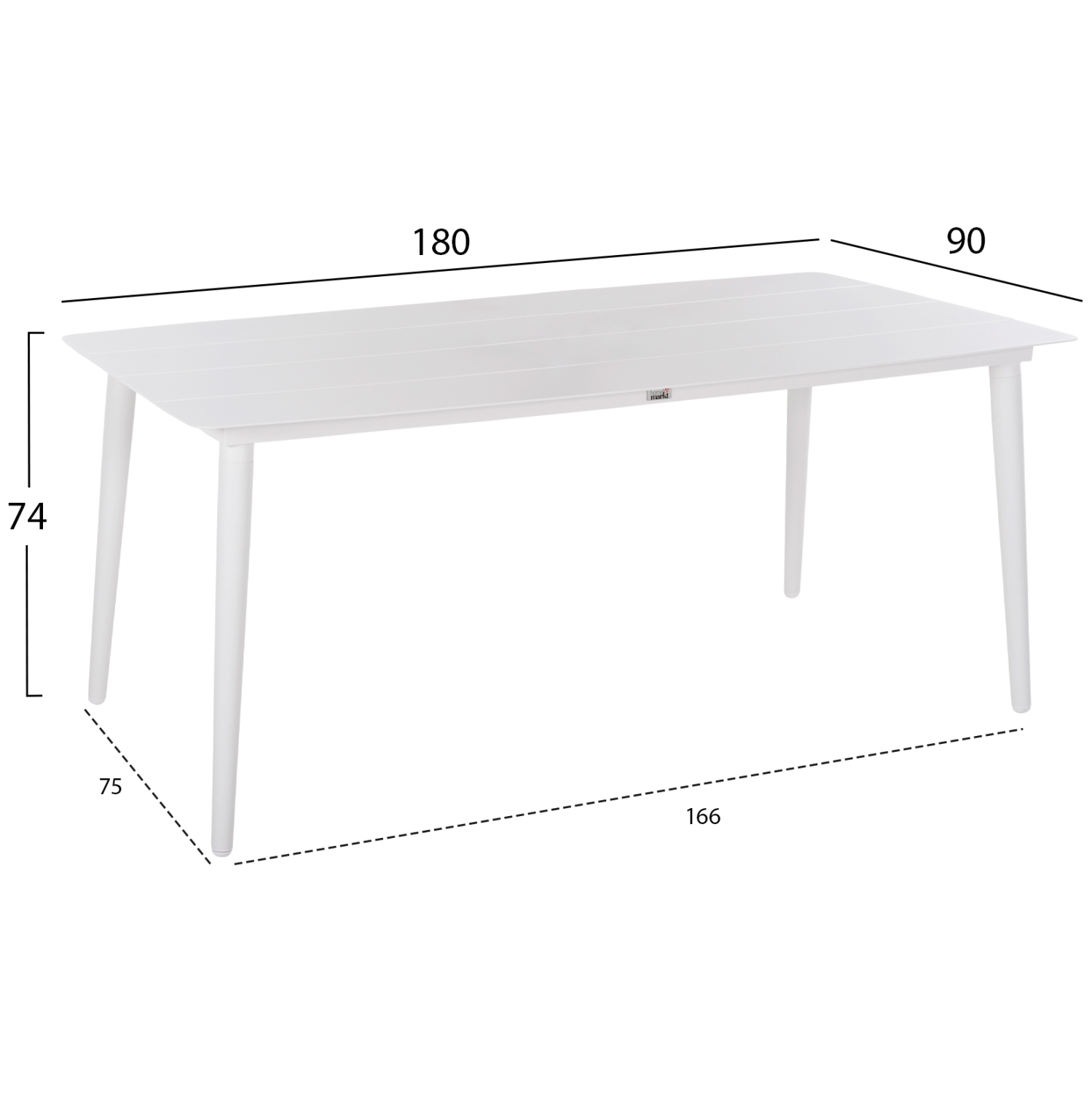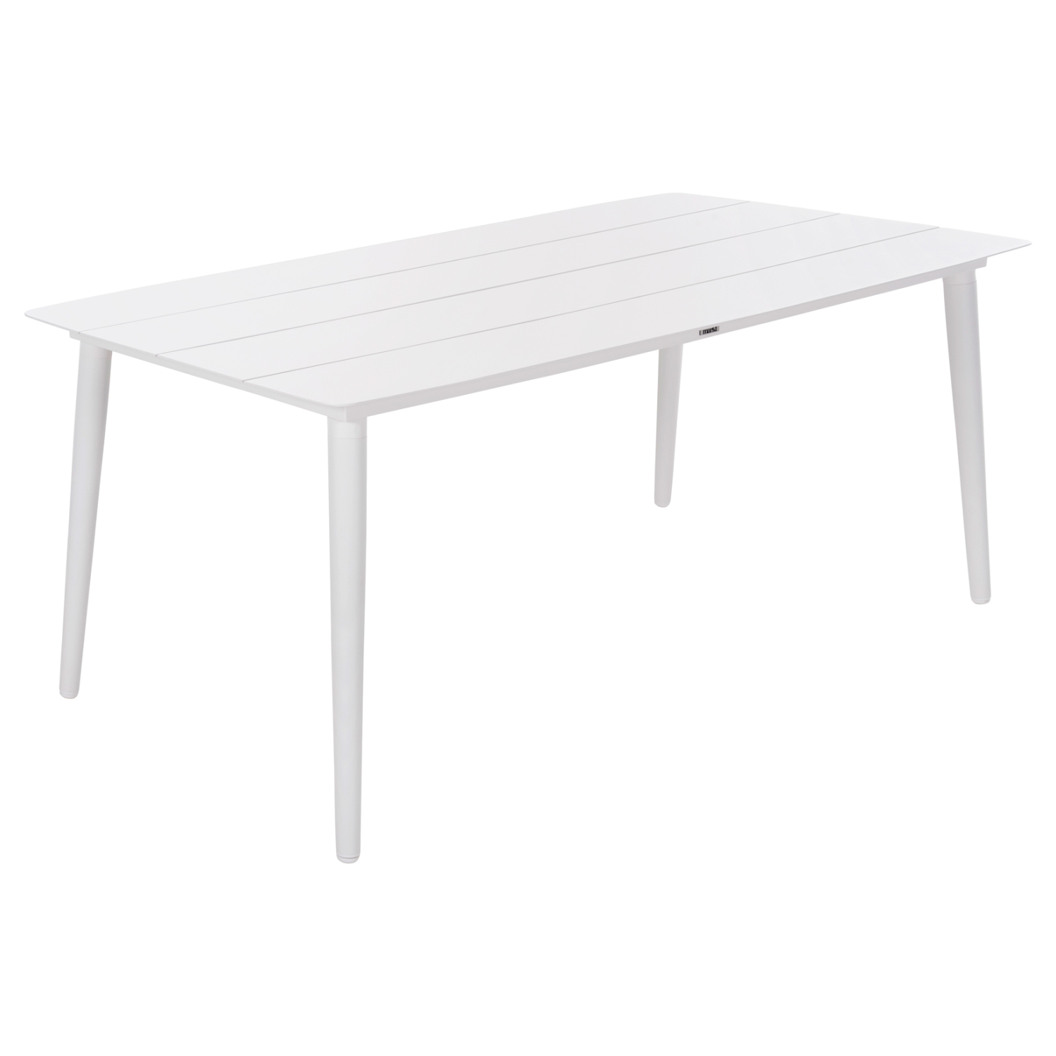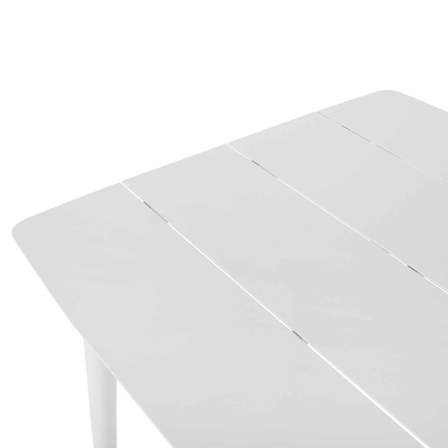 Το JEROM είναι ένα μεγάλο ορθογώνιο τραπέζι για εξωτερικούς χώρους εξολοκλήρου από αλουμίνιο σε ΛΕΥΚΟ χρώμα. Η επιφάνεια αποτελείται από 4 πλάκες αλουμινίου επίσης σε ΛΕΥΚΟ χρώμα, ενώ τα 4 πόδια είναι σε κυλινδρική υλοποίηση. Πρόκειται για ένα τραπέζι που χαρακτηρίζεται από ανθεκτικότητα και πρακτικότητα.
