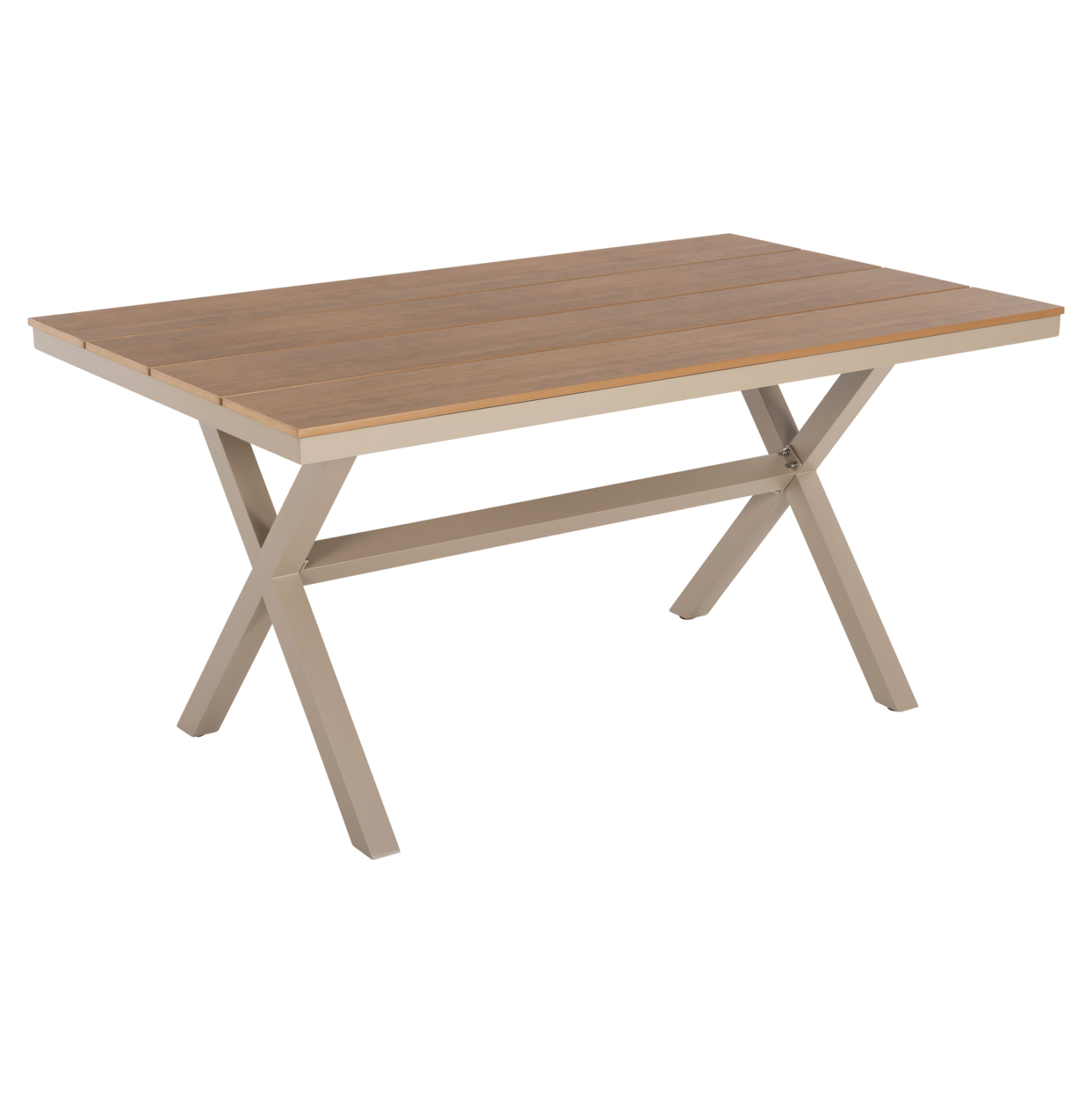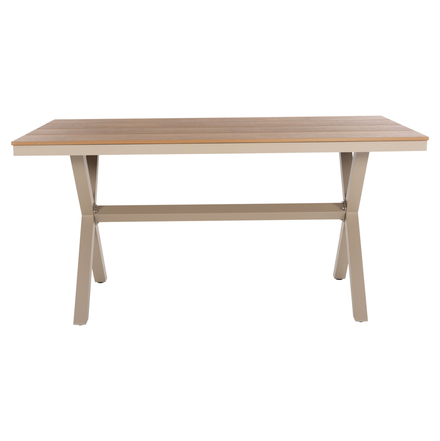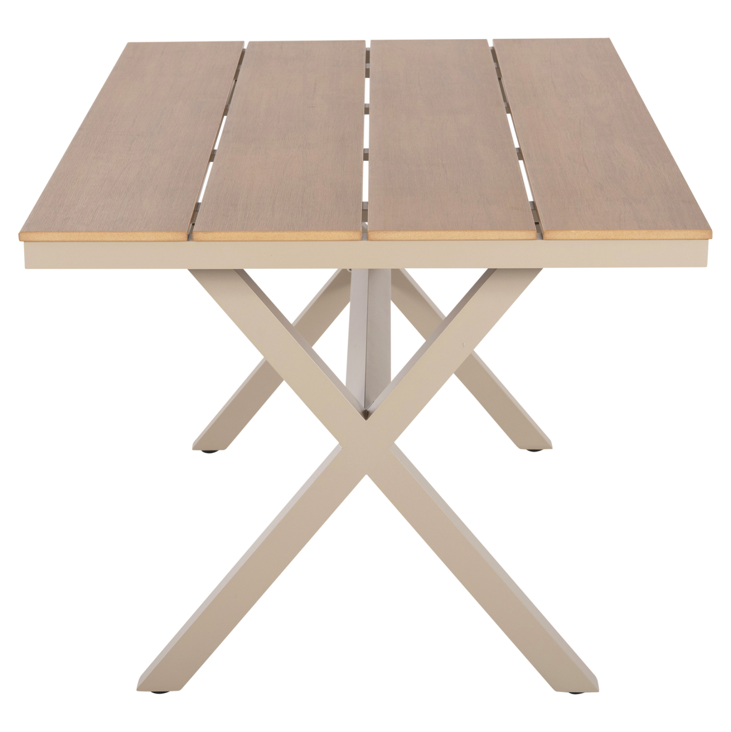 Το TAWNEE είναι ένα ορθογώνιο τραπέζι για εξωτερικούς χώρους με σκελετό αλουμινίου σε χιαστί διάταξη ποδιών που συνδέονται με μια μπάρα αλουμινίου και έχει ΣΑΜΠΑΝΙ χρώμα. Η επιφάνεια είναι από πλάκες polywood σε ΦΥΣΙΚΟ χρώμα ξύλου. Πρόκειται για ένα όμορφο τραπέζι σε μεγάλη διάσταση, που μπορεί να εξυπηρετήσει 6 τουλάχιστον άτομα.