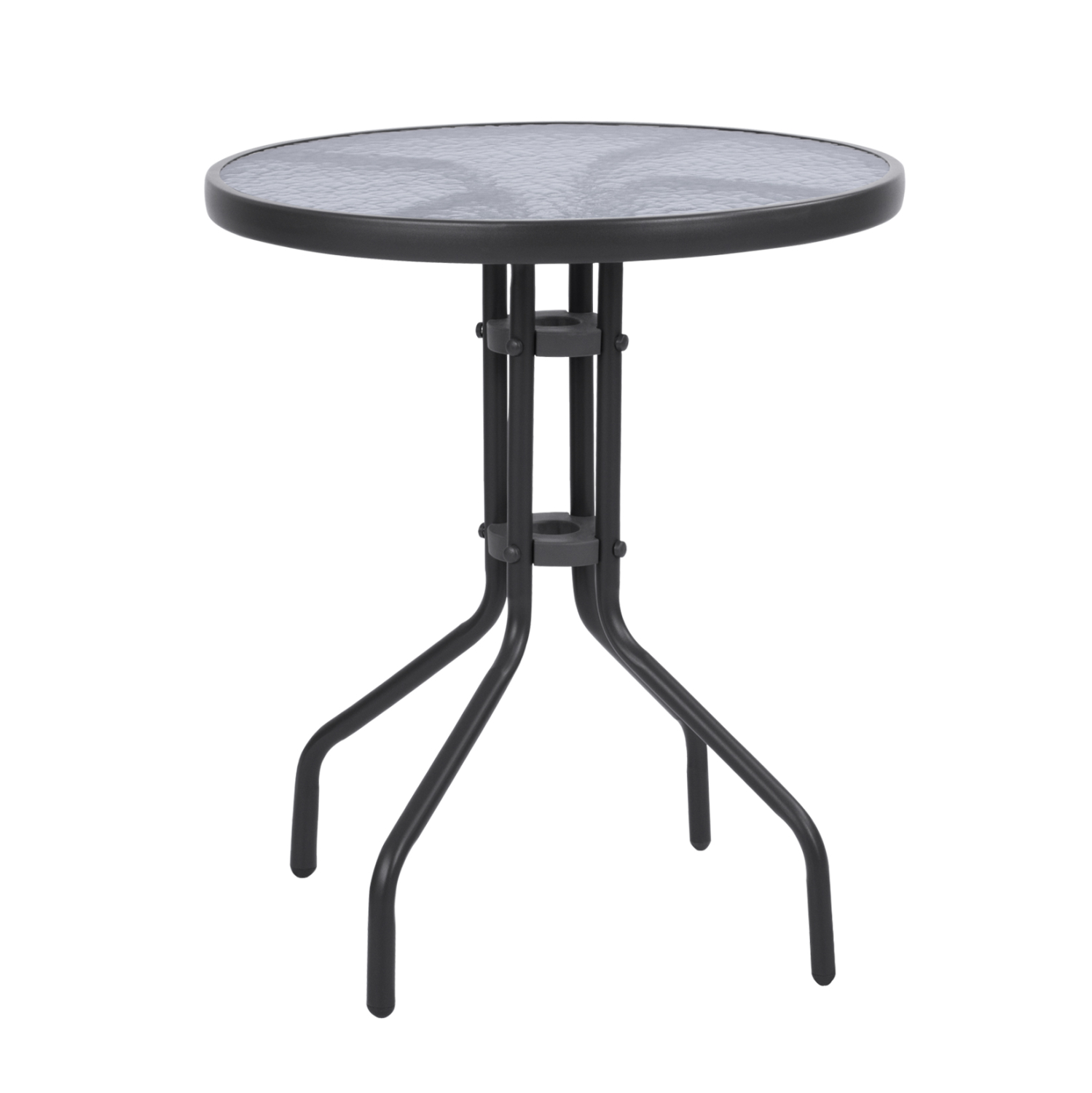 Τραπέζι εξωτερικού χώρου μεταλλικό σε γκρι απόχρωση με γυαλί ασφαλείας στην επιφάνειά του.