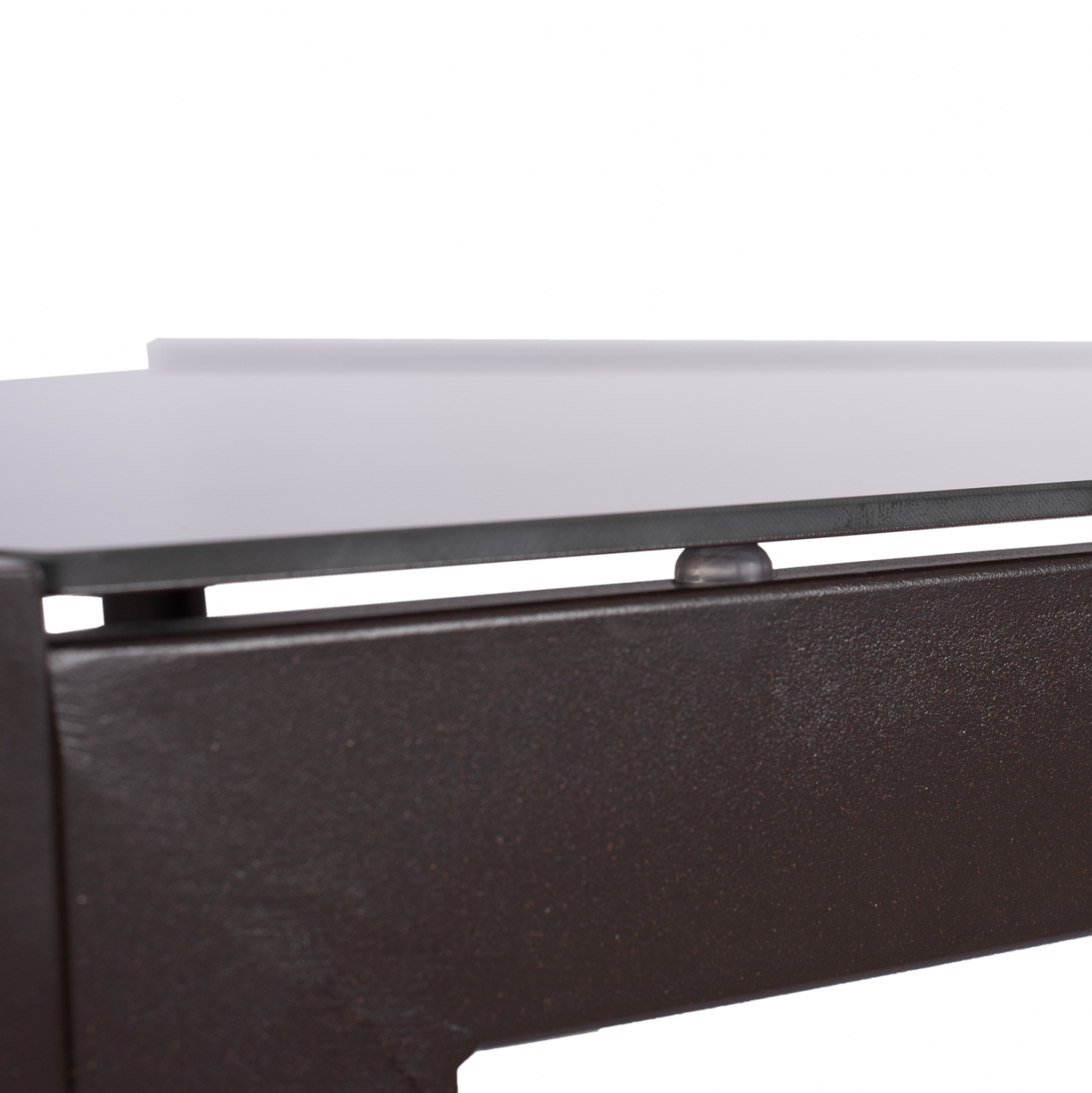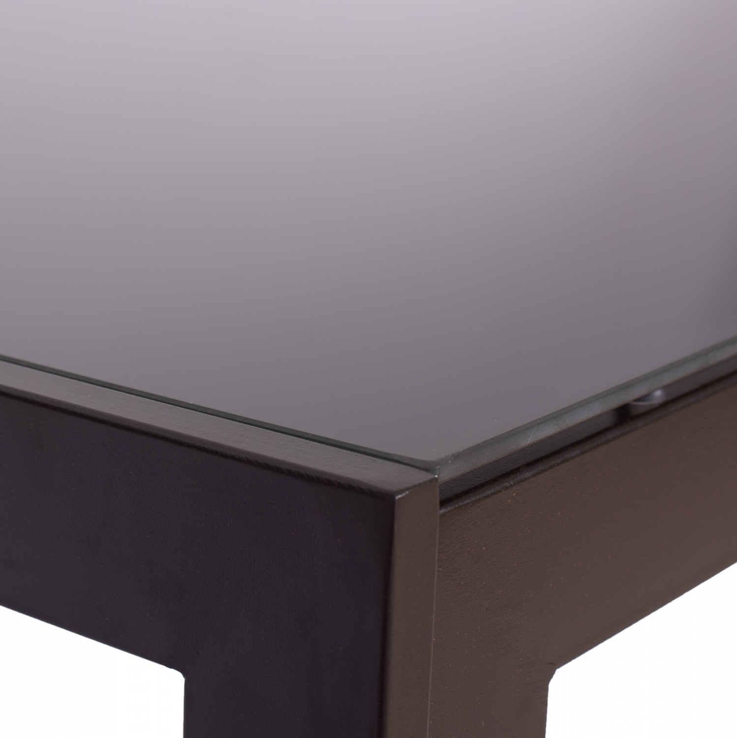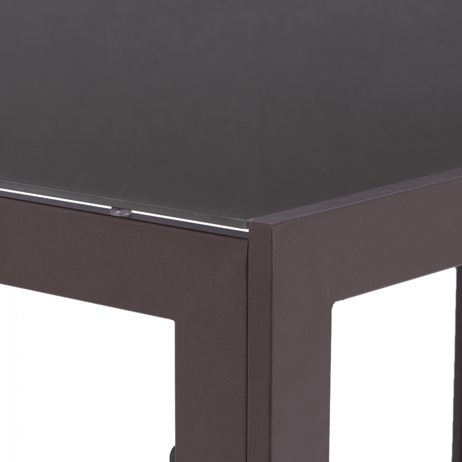Τραπέζι εξωτερικού χώρου μεταλλικό σε απόχρωση καφέ με γυαλί στην επιφάνειά του.