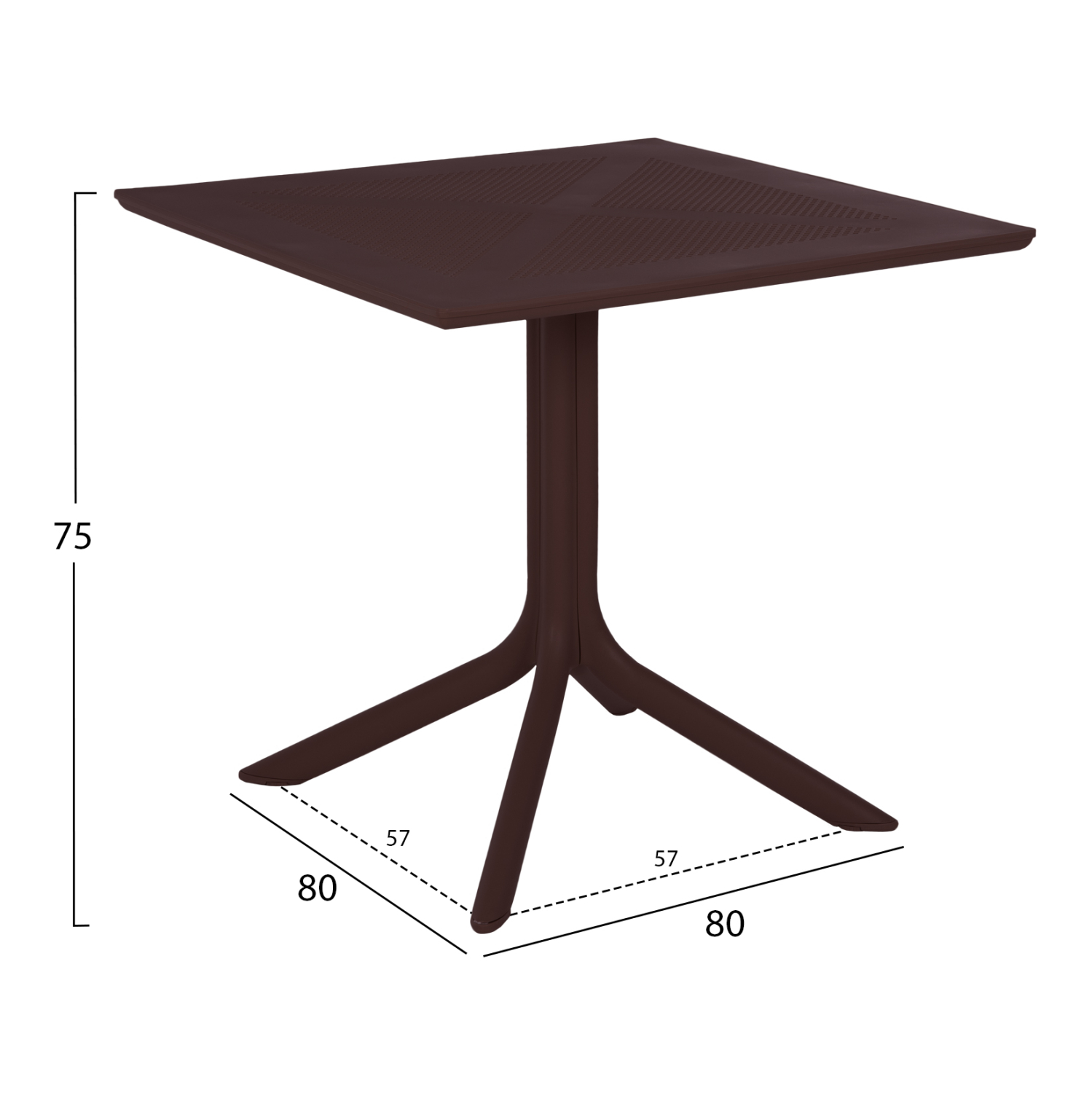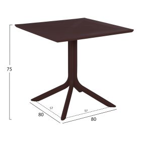 Τραπέζι πολυπροπυλενίου σε ΚΑΦΕ χρώμα. Ιδανική πρόταση για χρήση σε εξωτερικούς χώρους, είτε επαγγελματικούς (χώροι δεξιώσεων, εταιρείες catering, κλπ.) είτε για το σπίτι. Το τραπέζι αποτελείται από μια «τρυπητή» τετράγωνη επιφάνεια, ενώ η στήριξη γίνεται με μια κολώνα στο κέντρο που καταλήγει σε 4 πόδια («νύχια»).