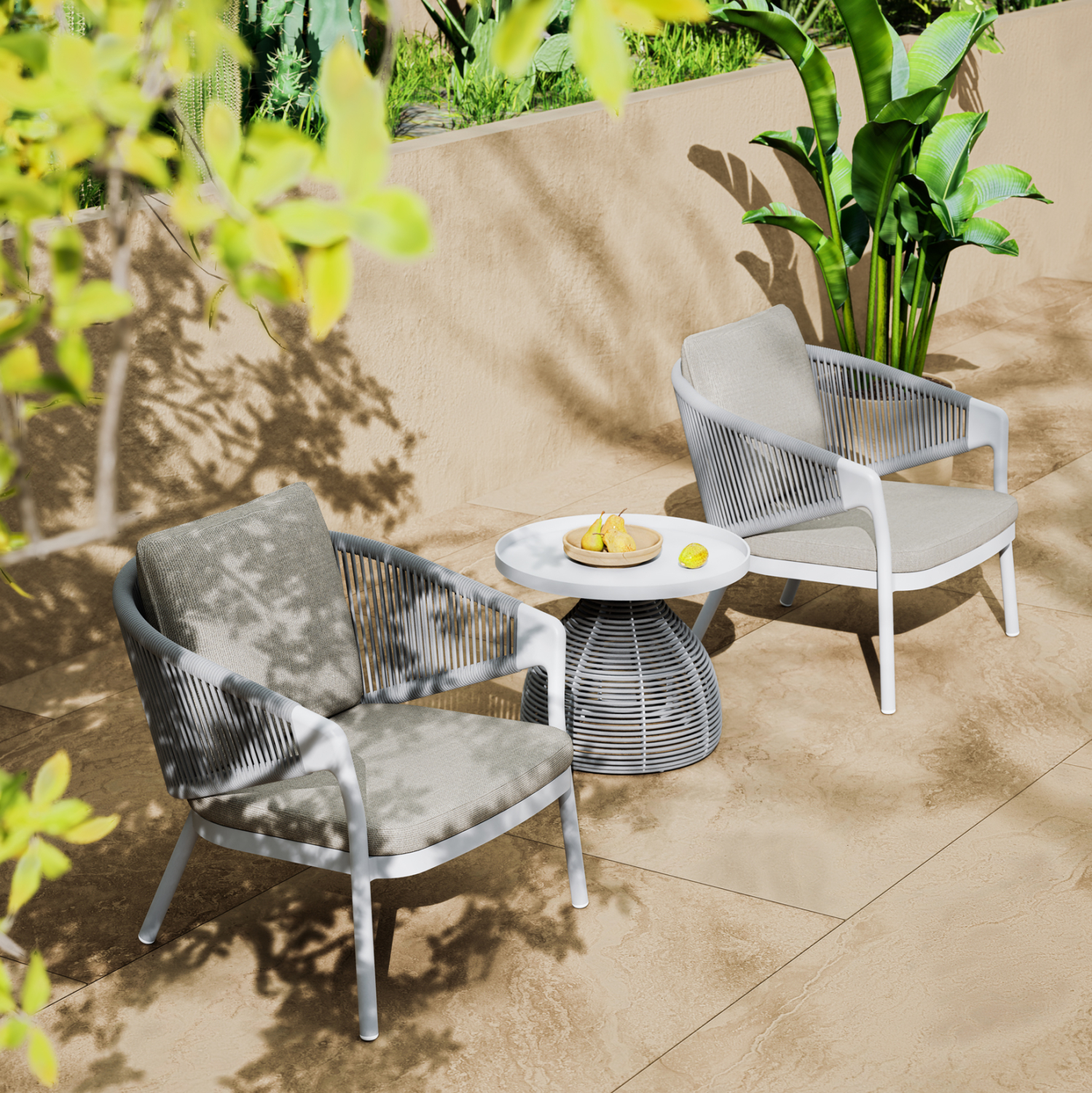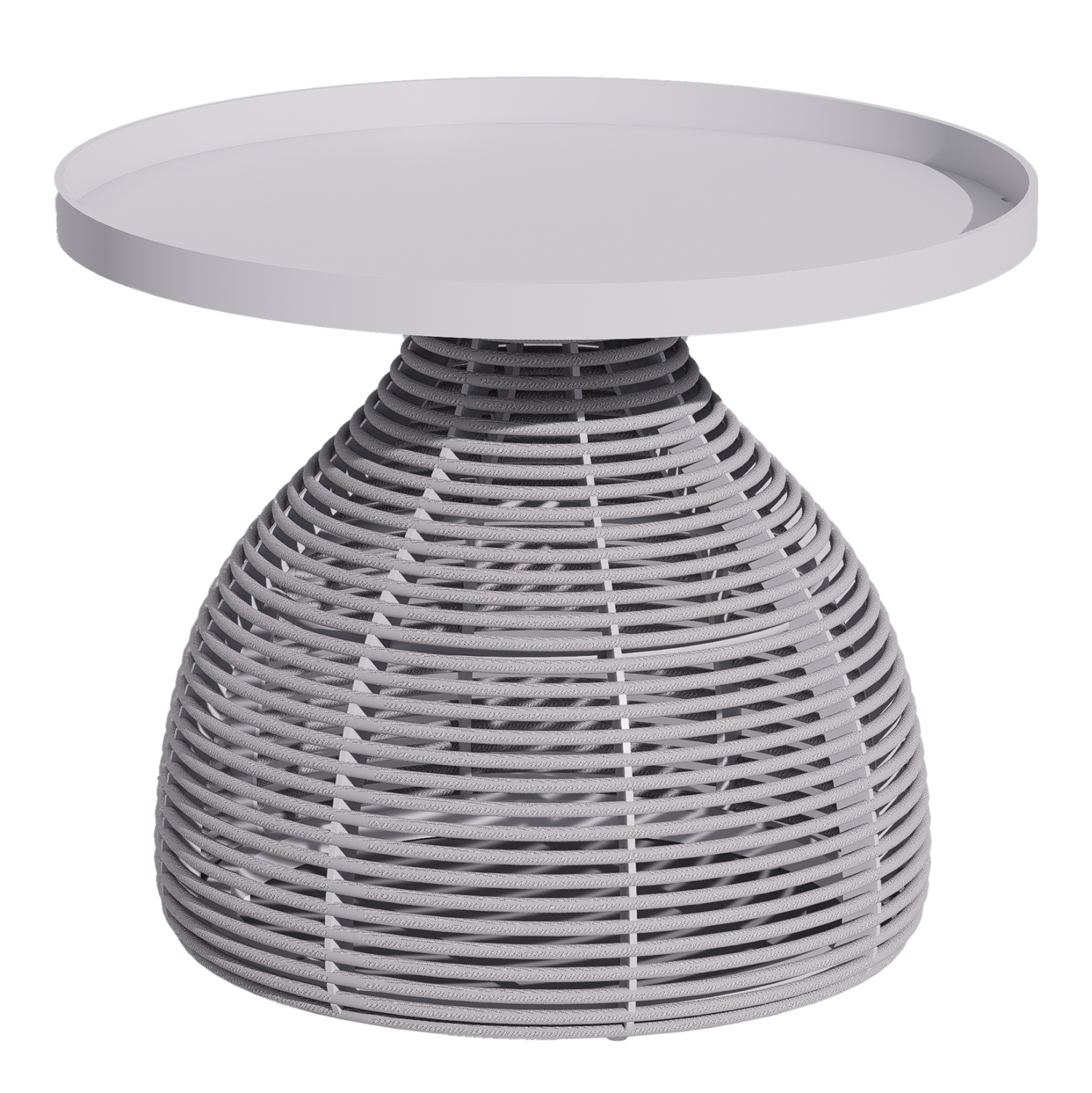 Στρογγυλό βοηθητικό τραπεζάκι εξωτερικού χώρου με επιφάνεια αλουμινίου και κορμό από αλουμίνιο επενδυμένο με σχοινί. Η συνολική κατασκευή σε ΚΡΕΜ και ΑΝΟΙΧΤΗ ΓΚΡΙ απόχρωση προσφέρει σύγχρονη αισθητική ενώ τα υλικά κατασκευής προσφέρουν υψηλή αντοχή στις εξωτερικές συνθήκες.