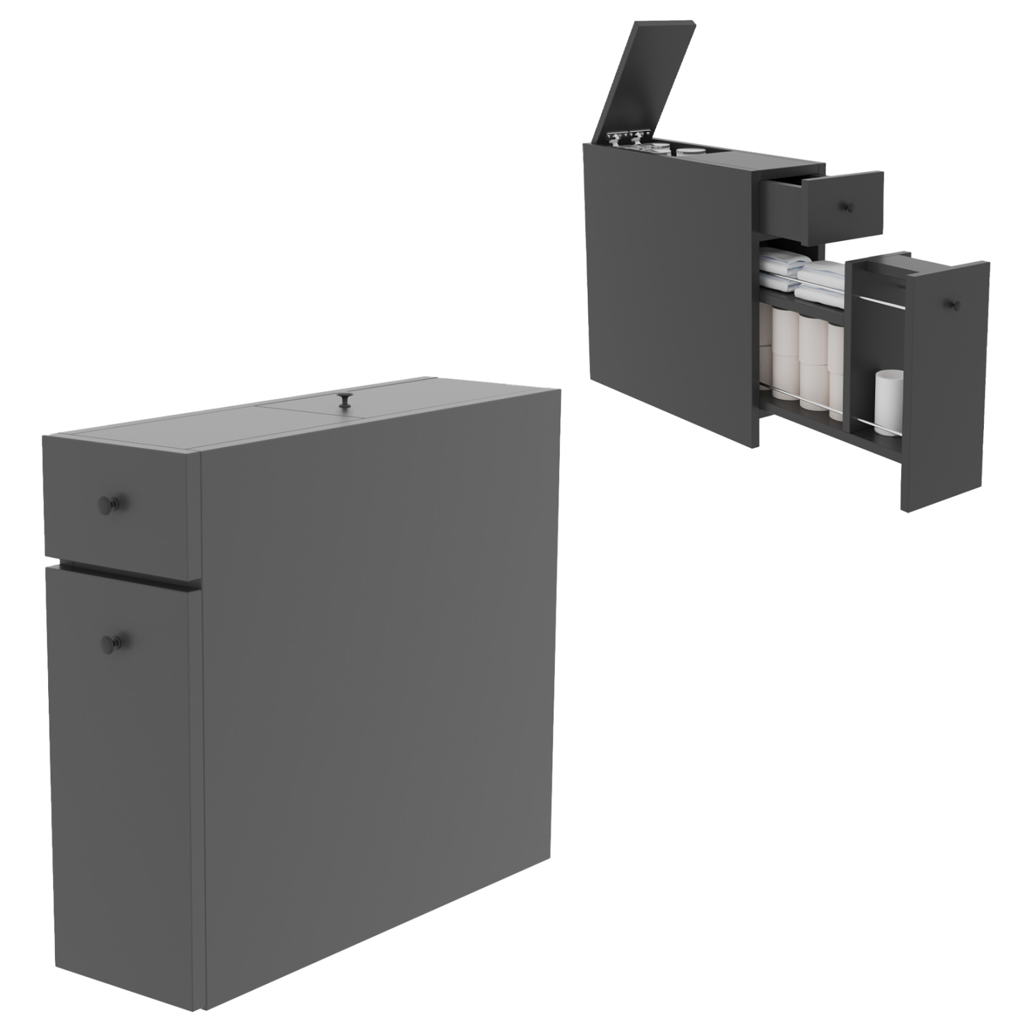 ΗΜ9424.01- Ντουλάπι πολλαπλών χρήσεων----Σας παρουσιάζουμε το καινούριο έπιπλο για τον χώρο του μπάνιου σε όμορφο ανθρακί χρώμα. Είναι ένα μονοκόμματο έπιπλο στενό και κοντό, με ένα συρτάρι ψηλό και βαθύ στο κάτω μέρος και ένα συρτάρι μικρό από πάνω. Επίσης, διαθέτει κι έναν αποθηκευτικό χώρο πίσω από το μικρό συρτάρι που ανοίγει από πάνω με πορτάκι. Πρόκειται για ένα πρακτικό έπιπλο που θα σας λύσει τα χέρια τόσο με τους αποθηκευτικούς χώρους που διαθέτει, όσο και με τις βολικές του διαστάσεις.