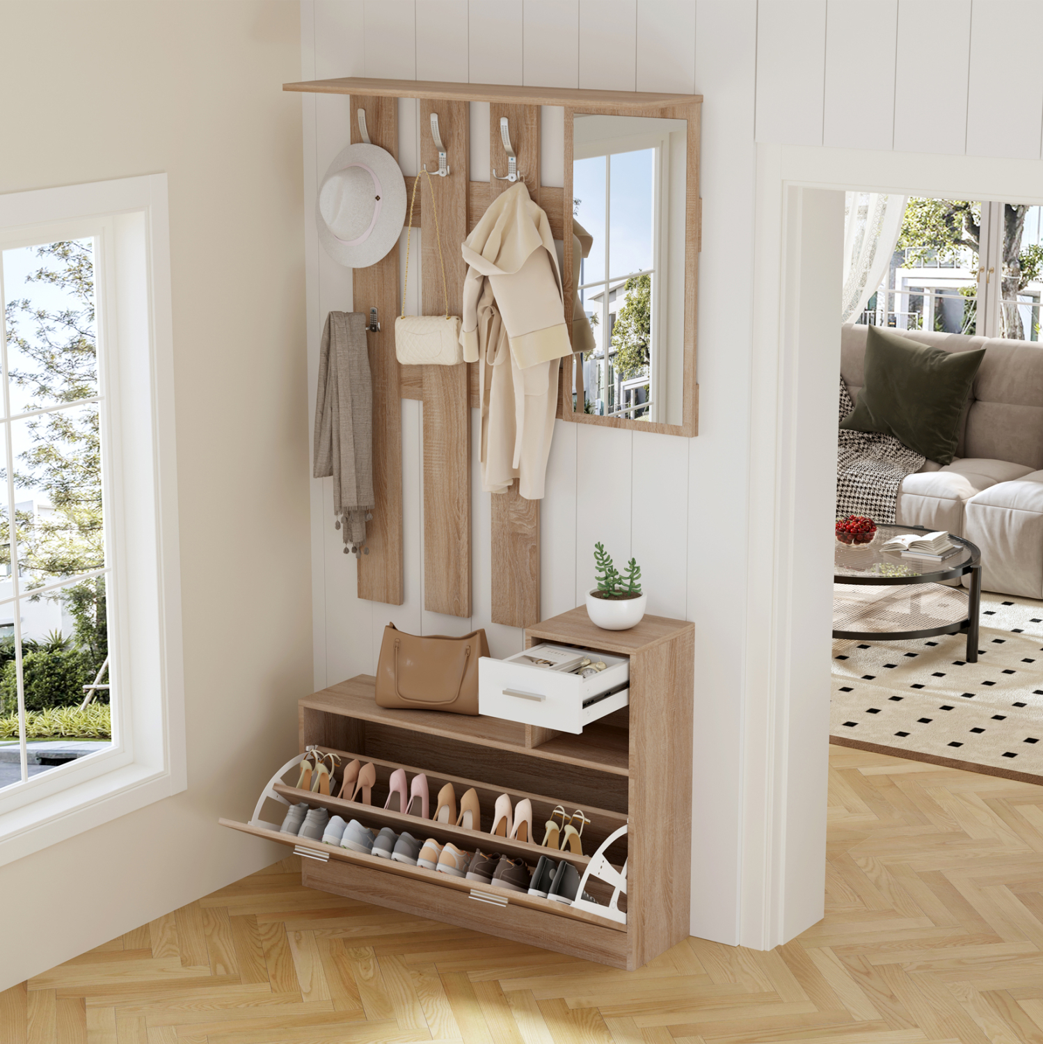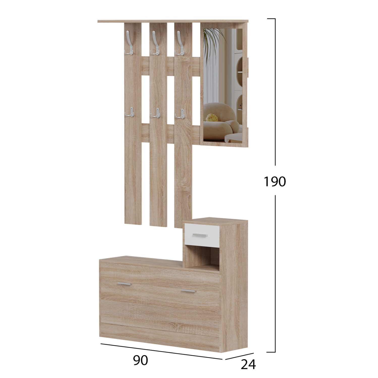 Το έπιπλο εισόδου GORN αποτελείται από μια παπουτσοθήκη-ντουλάπι με δύο πόρτες και έναν μικρό ανοιχτό αποθηκευτικό χώρο κι ένα συρτάρι. Επάνω από την παπουτσοθήκη και αναρτημένη στον τοίχο είναι μια κατασκευή με κρεμάστρες ως βεστιάριο και ένας καθρέπτης, ενώ υπάρχει και ένα ράφι τέρμα επάνω. Ένα σετ μελαμίνης σε χρώμα SONAMA-ΛΕΥΚΟ που θα σας ενθουσιάσει με την πρακτικότητα του.