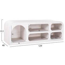 Το έπιπλο τηλεόρασης HANDYR είναι εξολοκλήρου κατασκευασμένο από μασίφ ξύλο mango σε ΛΕΥΚΟ χρώμα. Οι γωνίες και οι άκρες είναι στρογγυλεμένες ενώ διαθέτει 5 ανοιχτούς χώρους αποθήκευσης ή τοποθέτησης αντικειμένων. Το μήκος της επιφάνειάς του είναι ικανοποιητικό και χωράει τις περισσότερες τηλεοράσεις, εάν αποφασίσετε να την τοποθετήσετε στην βάση της και όχι στον τοίχο.