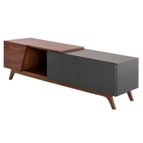 Το έπιπλο τηλεόρασης HUDSON σε ΚΑΡΥΔΙ και ΣΚΟΥΡΟ ΓΚΡΙ χρώμα είναι ένα μοντέρνο και όμορφο έπιπλο. Έχει ψηλά πόδια και στην μία πλευρά ένα ντουλάπι χωρίς ράφι. Στην άλλη πλευρά υπάρχουν 2 βαθιά συρτάρια. Στην μέση του επίπλου υπάρχει ανοιχτός χώρος. Το χαρακτηριστικό του επίπλου είναι ότι η πόρτα και τα συρτάρια δεν διαθέτουν χερούλια αλλά ανοίγουν με «κρυφές» εσοχές. Το μήκος του εξασφαλίζει ότι η επιφάνεια του είναι μεγάλη και αρκετή για τοποθέτηση πολλών αντικειμένων ή ακόμα και της τηλεόρασής σας αν επιλέξετε να μην την κρεμάσετε στον τοίχο.