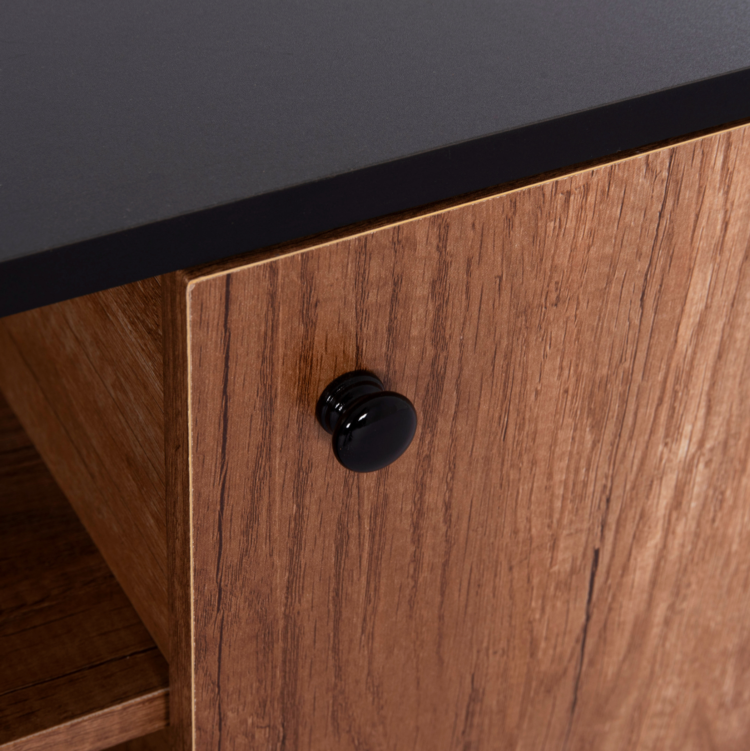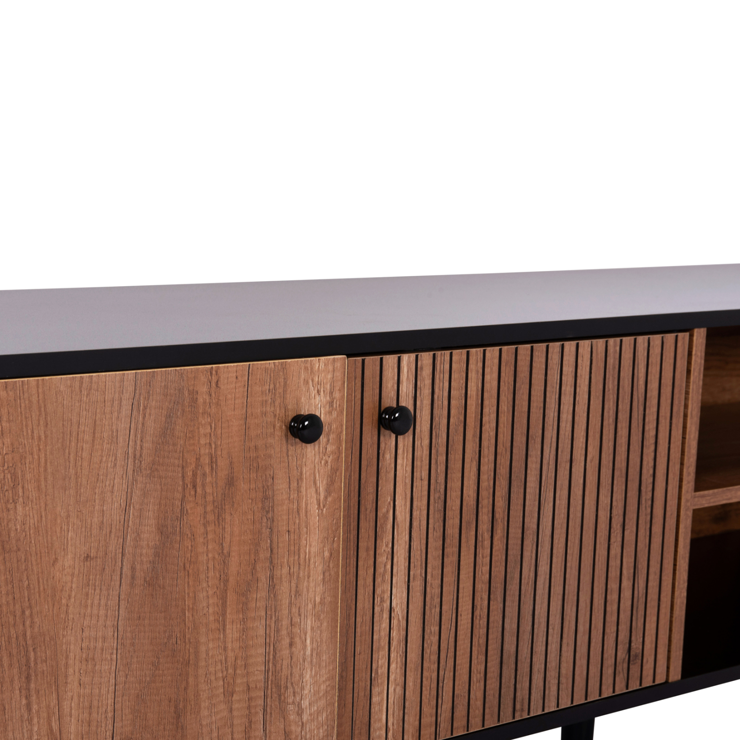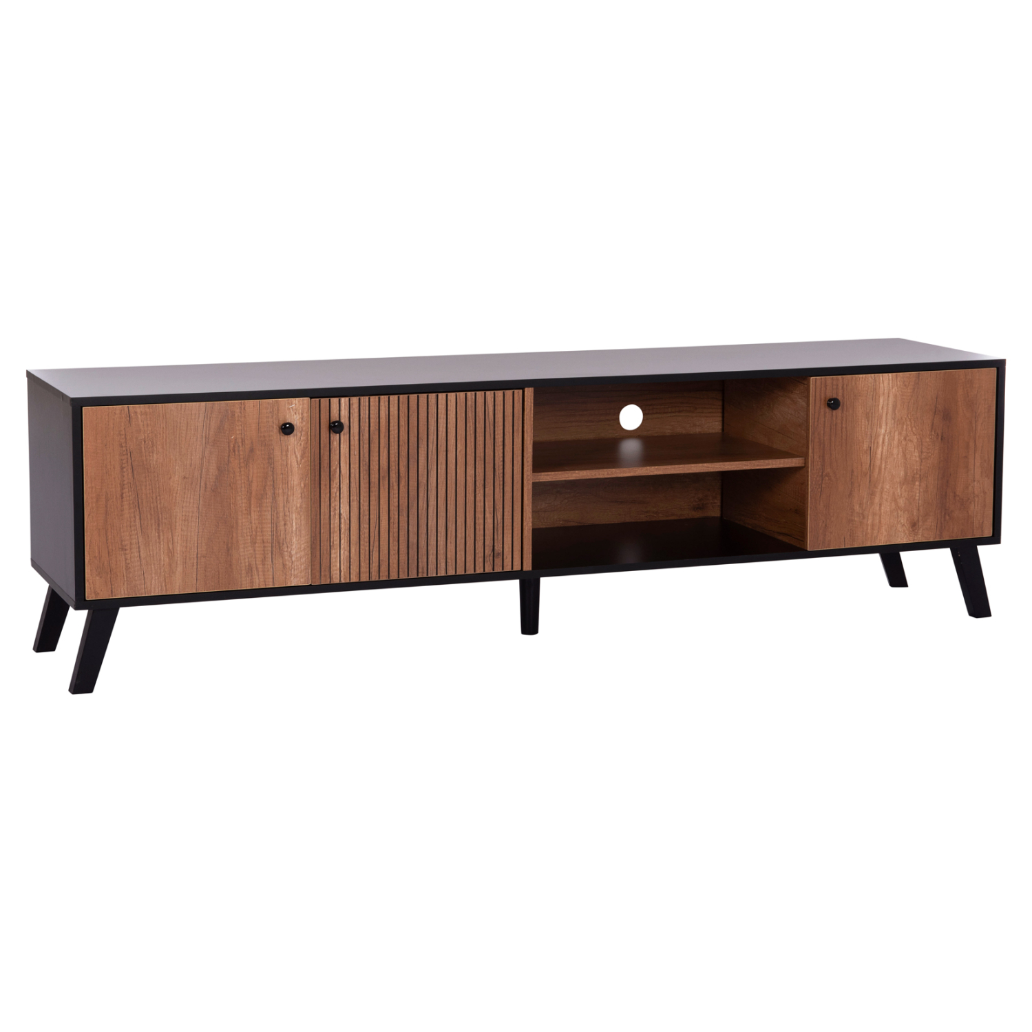 Το KRUDEN είναι ένα μοντέρνο και λειτουργικό έπιπλο τηλεόρασης, που θα ομορφύνει το σαλόνι σας! Είναι μακρύ και διαθέτει 2 ντουλάπια με ενιαίο χώρο. Ένα με διπλή πόρτα, κι ένα ακόμα με μονή πόρτα. Ανάμεσα σε αυτά, υπάρχει ανοιχτός χώρος τοποθέτησης αντικειμένων με ένα ράφι. Τα χρώματα του επίπλου είναι το μαύρο που είναι και το χρώμα της επιφάνειας, και το φυσικό του ξύλου που είναι το χρώμα στα ντουλάπια. Πρόκειται για μια κομψή και ολοκληρωμένη πρόταση για το σαλόνι σας!