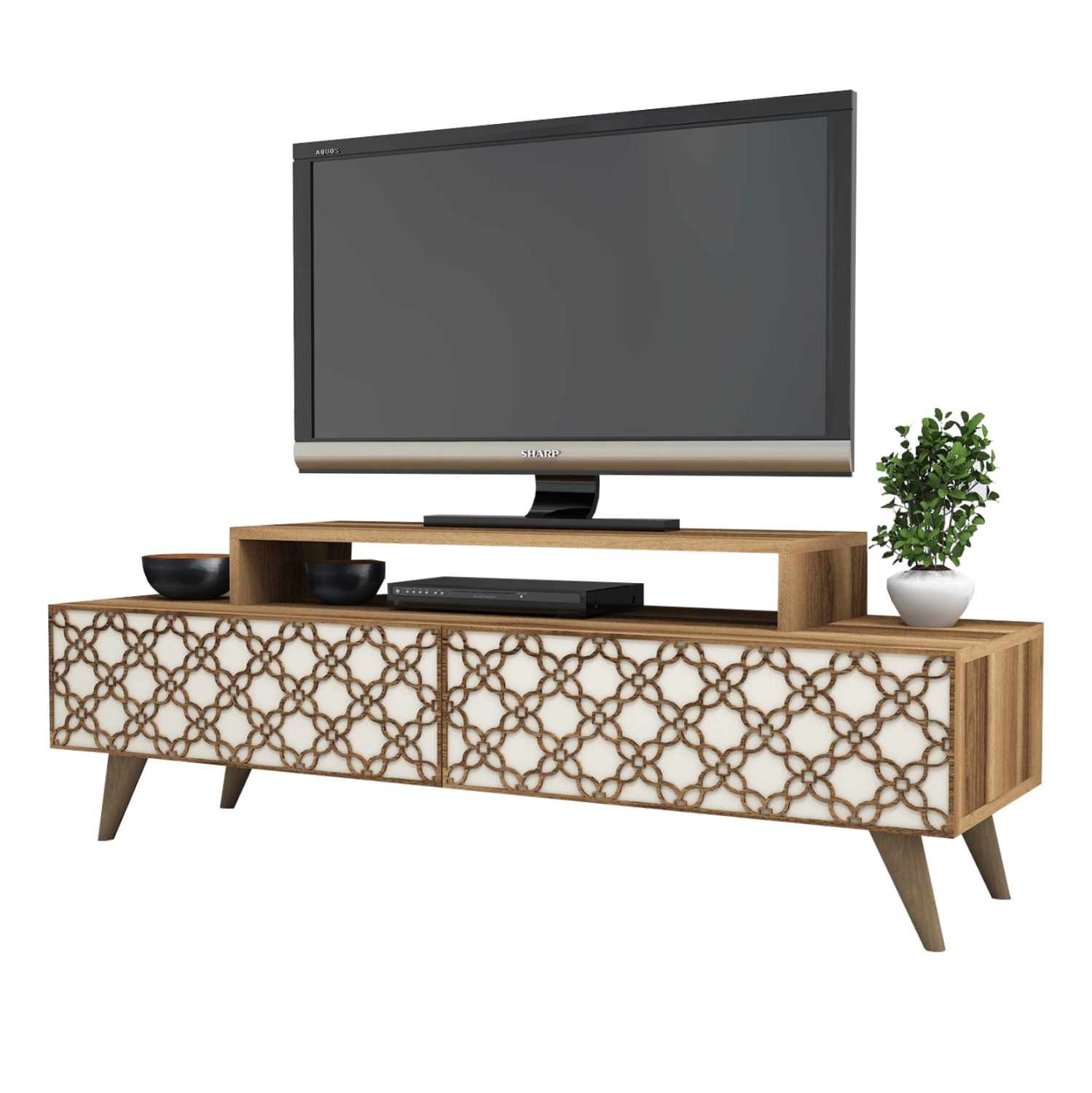 Το ΗΜ9510.03 είναι ένα μοντέρνο και λειτουργικό έπιπλο τηλεόρασης από μελαμίνη σε ΚΑΡΥΔΙ ΚΑΙ ΚΡΕΜ χρώμα, που θα ομορφύνει το σαλόνι σας! Είναι μακρύ και διαθέτει δύο ισομεγέθη ντουλάπια ως κύριο χώρο αποθήκευσης ή τοποθέτησης αντικειμένων. Η εμπρός όψη των ντουλαπιών, που ανοίγουν κατακόρυφα, είναι διακοσμημένη με μηχανικά κατασκευασμένα (CNC Relief) και όμορφα συμμετρικά σχέδια. Επάνω στην κύρια επιφάνεια υπάρχει ακόμα μια μικρότερη βάση στην οποία τοποθετείται η τηλεόραση ενώ από κάτω υπάρχει χώρος για τοποθέτηση κι άλλων συσκευών. Τα πόδια είναι σχετικά ψηλά. Οι διαστάσεις του επίπλου είναι κατάλληλες για όλες τις τηλεοράσεις εάν θέλετε η τηλεόρασή σας να στηρίζεται σε βάση. Πρόκειται για μια κομψή πρόταση για το σαλόνι σας!