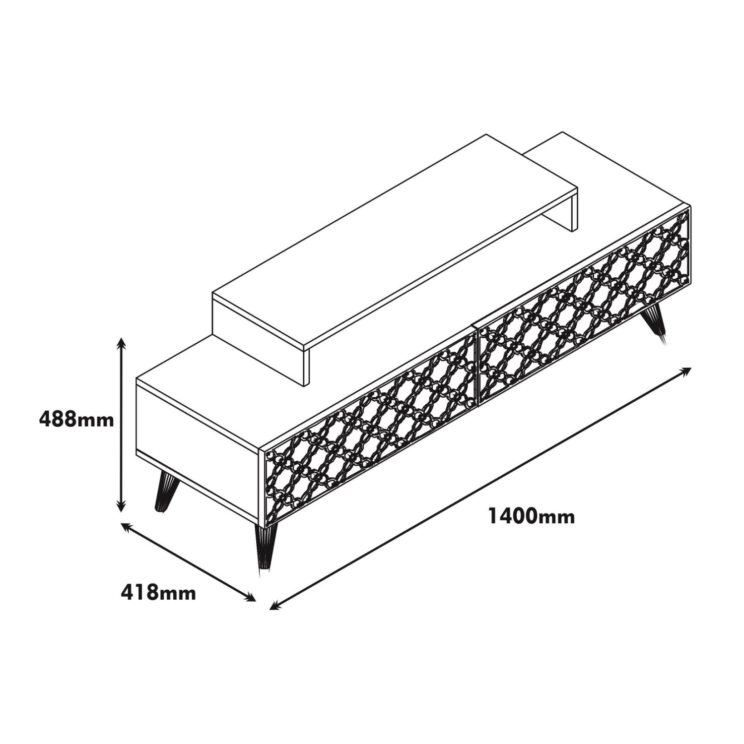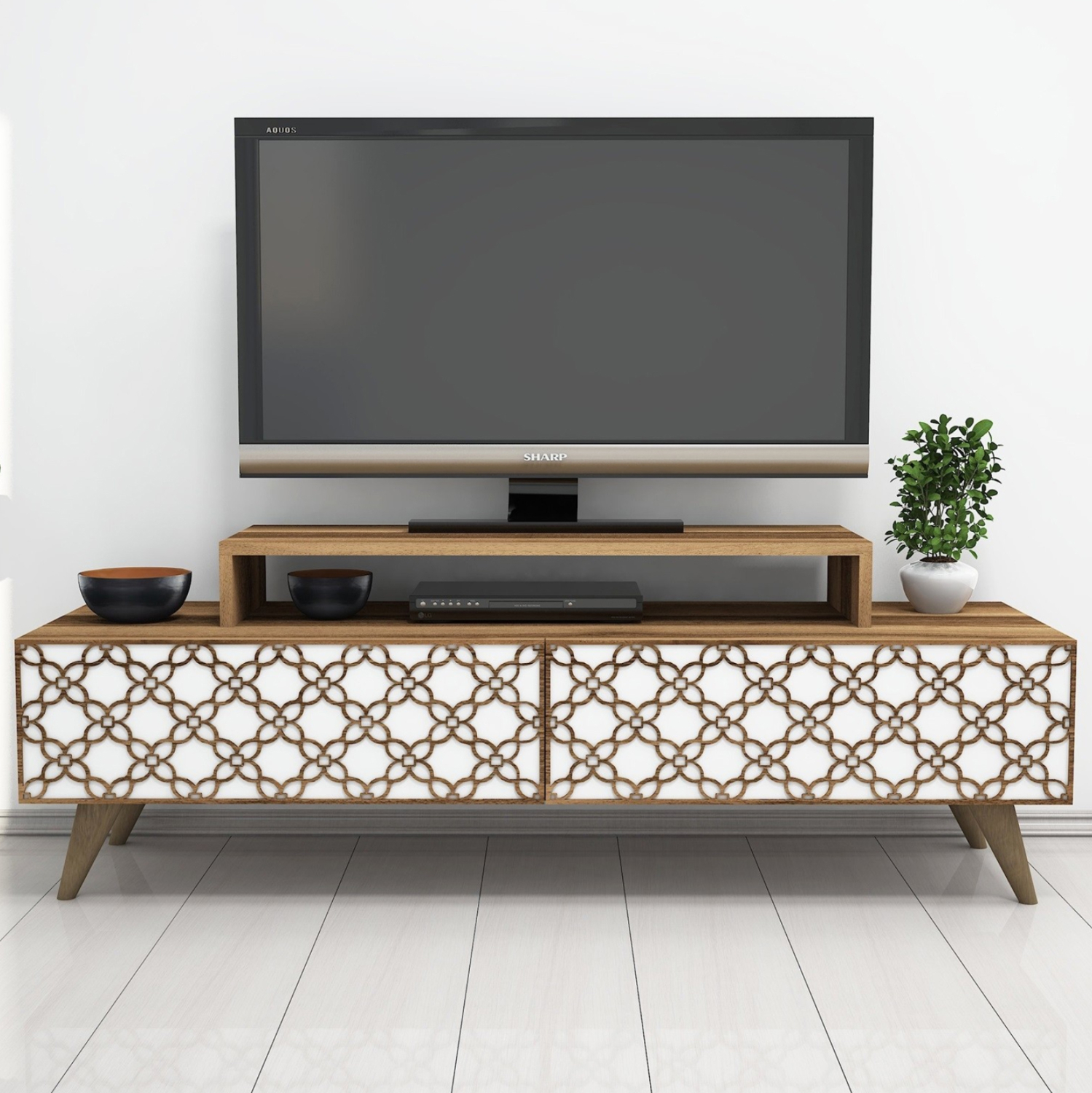 Το ΗΜ9510.04 είναι ένα μοντέρνο και λειτουργικό έπιπλο τηλεόρασης από μελαμίνη σε ΚΑΡΥΔΙ ΚΑΙ ΛΕΥΚΟ χρώμα, που θα ομορφύνει το σαλόνι σας! Είναι μακρύ και διαθέτει δύο ισομεγέθη ντουλάπια ως κύριο χώρο αποθήκευσης ή τοποθέτησης αντικειμένων. Η εμπρός όψη των ντουλαπιών, που ανοίγουν κατακόρυφα, είναι διακοσμημένη με μηχανικά κατασκευασμένα (CNC Relief) και όμορφα συμμετρικά σχέδια. Επάνω στην κύρια επιφάνεια υπάρχει ακόμα μια μικρότερη βάση στην οποία τοποθετείται η τηλεόραση ενώ από κάτω υπάρχει χώρος για τοποθέτηση κι άλλων συσκευών. Τα πόδια είναι σχετικά ψηλά. Οι διαστάσεις του επίπλου είναι κατάλληλες για όλες τις τηλεοράσεις εάν θέλετε η τηλεόρασή σας να στηρίζεται σε βάση. Πρόκειται για μια κομψή πρόταση για το σαλόνι σας!