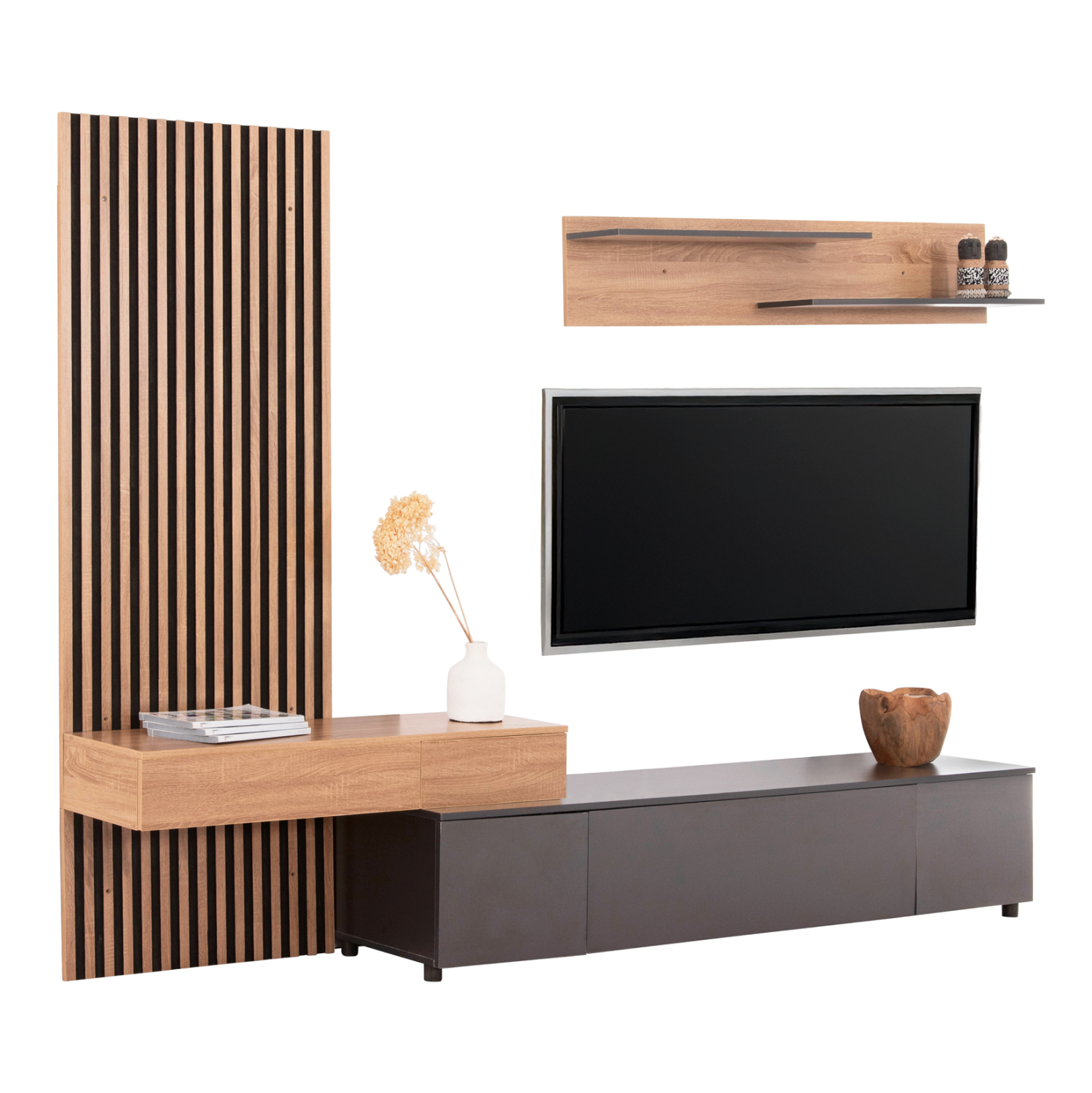 Η σύνθεση επίπλου για την τηλεόραση DORT είναι μια μοντέρνα πρόταση σε ΣΚΟΥΡΟ ΓΚΡΙ και ΣΟΝΑΜΑ χρώμα, που θα ομορφύνει το σαλόνι σας! Αποτελείται από μια διακοσμητική «πλάτη», έναν επιτοίχιο συνδυασμό με 2 ραφάκια στο επάνω μέρος και το κυρίως έπιπλο δαπέδου. Το design είναι σε μοντέρνα γραμμή και είναι σίγουρο ότι οι αποθηκευτικοί χώροι θα εντυπωσιάσουν και τους πιο δύσκολους, τόσο στην όψη όσο και με την πρακτικότητά τους.